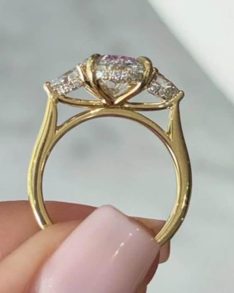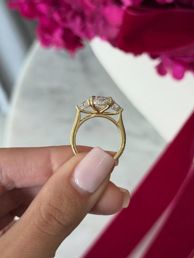 Crafted with a balance of modern elegance and timeless charm, the oval center stone enhances brilliance and creates a flattering, elongated look on the finger. The pear-cut side stones add soft sparkle and sophistication, elevating the overall design while maintaining a refined silhouette.