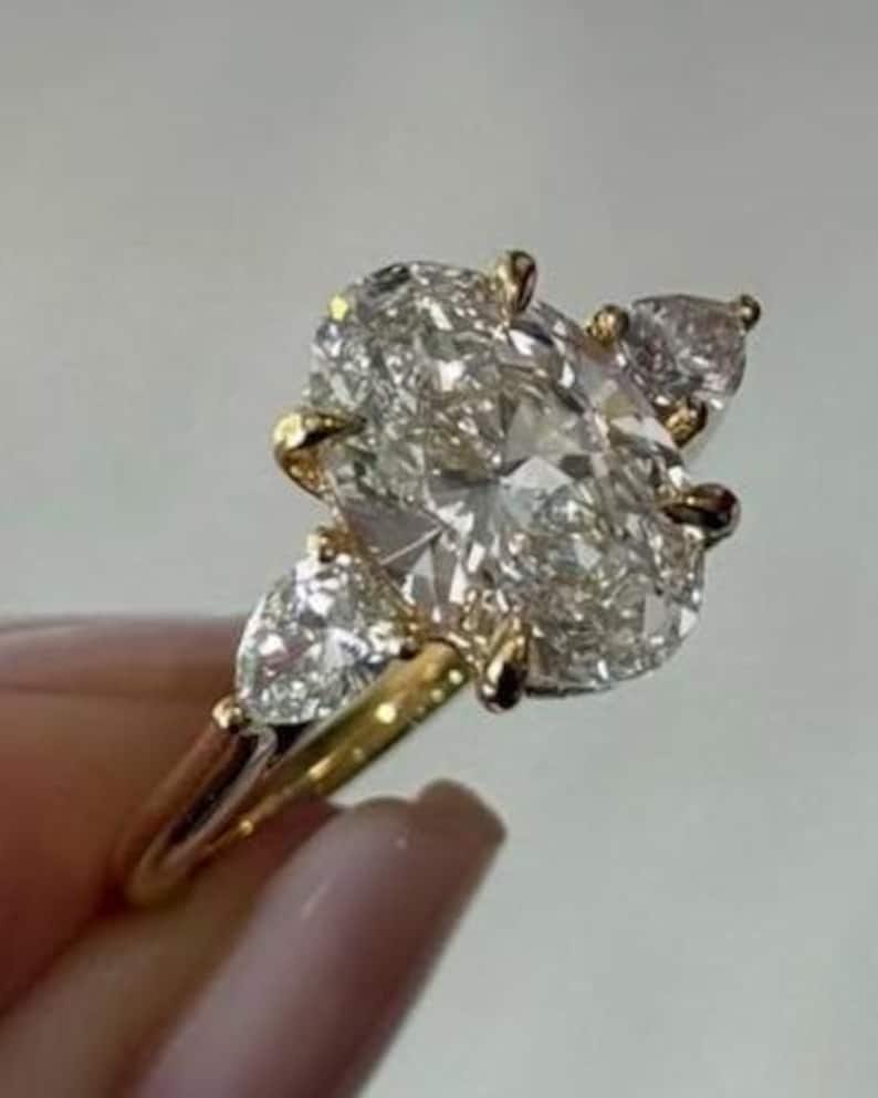 This breathtaking ring features a brilliant 3 carat oval-shaped moissanite center stone, beautifully complemented by pear-cut moissanite side stones. The classic three-stone design symbolizes your past, present, and future, making this ring a meaningful choice for life’s most special moments.