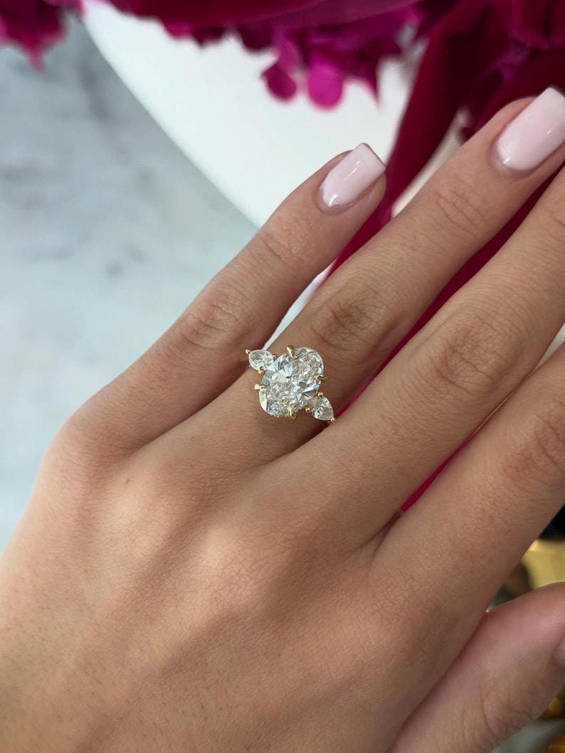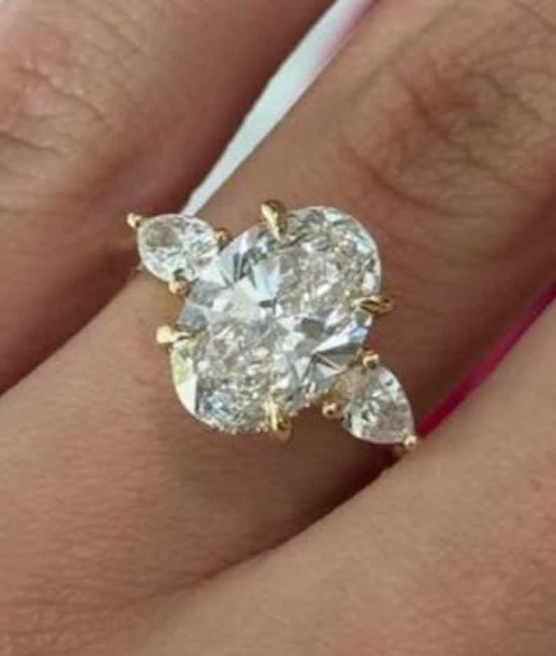 3 CT Oval Shape Moissanite Diamond Ring, Three Stone Engagement Ring, Side Pear Cut Moissanite, Wedding Anniversary Ring, Promise Ring