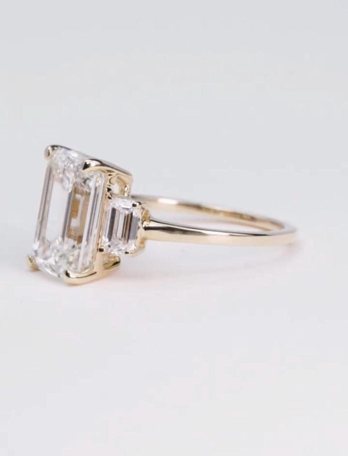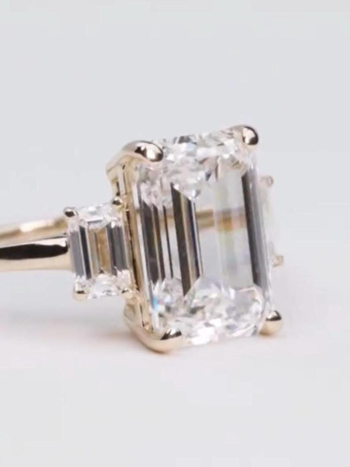 Featuring a stunning emerald-cut center moissanite accented by sparkling side stones, this ring showcases crisp lines, refined brilliance, and a sophisticated silhouette. The step-cut emerald stone offers a sleek, mirror-like shine, while the side stones enhance its beauty without overpowering the design.
