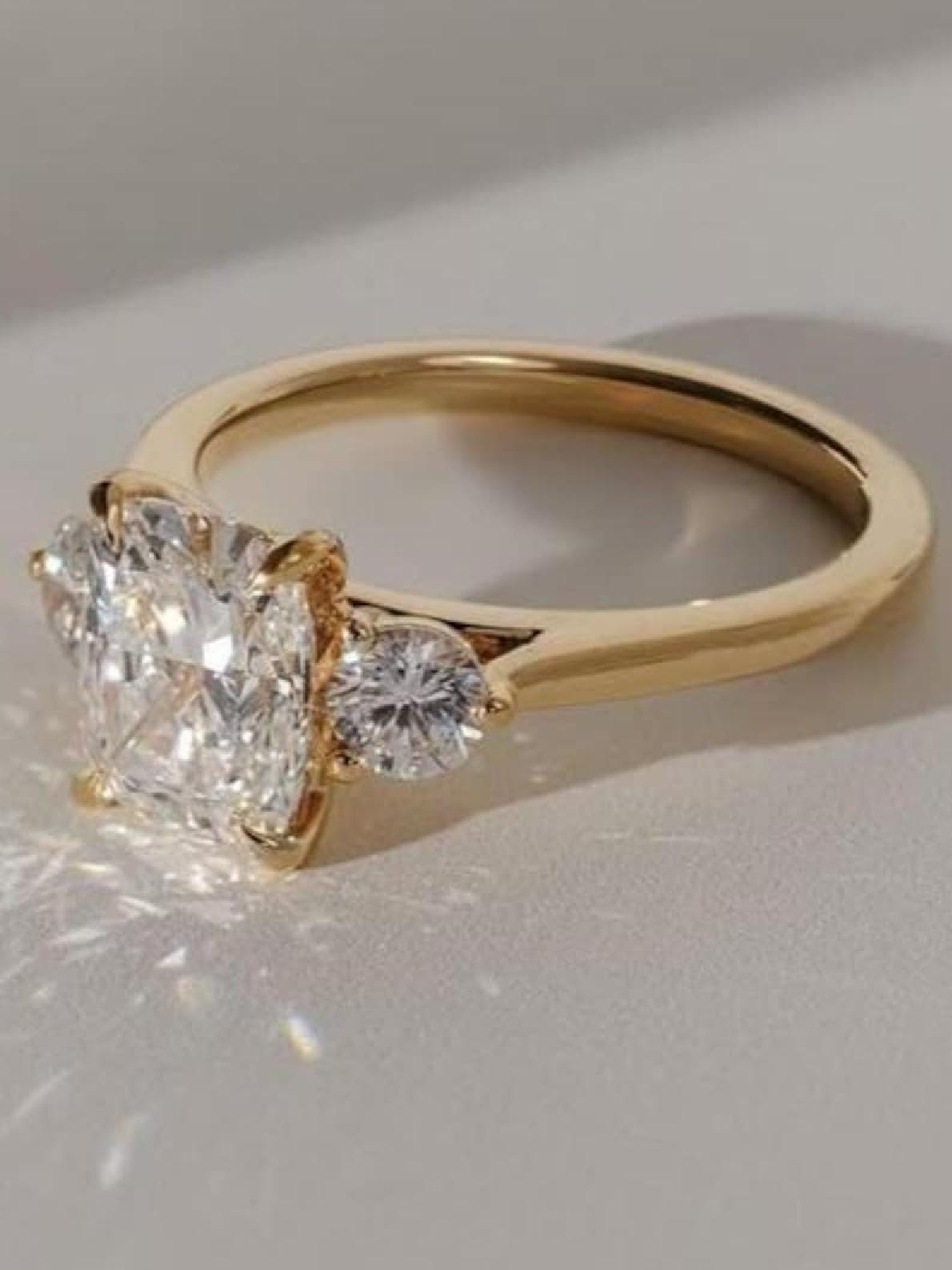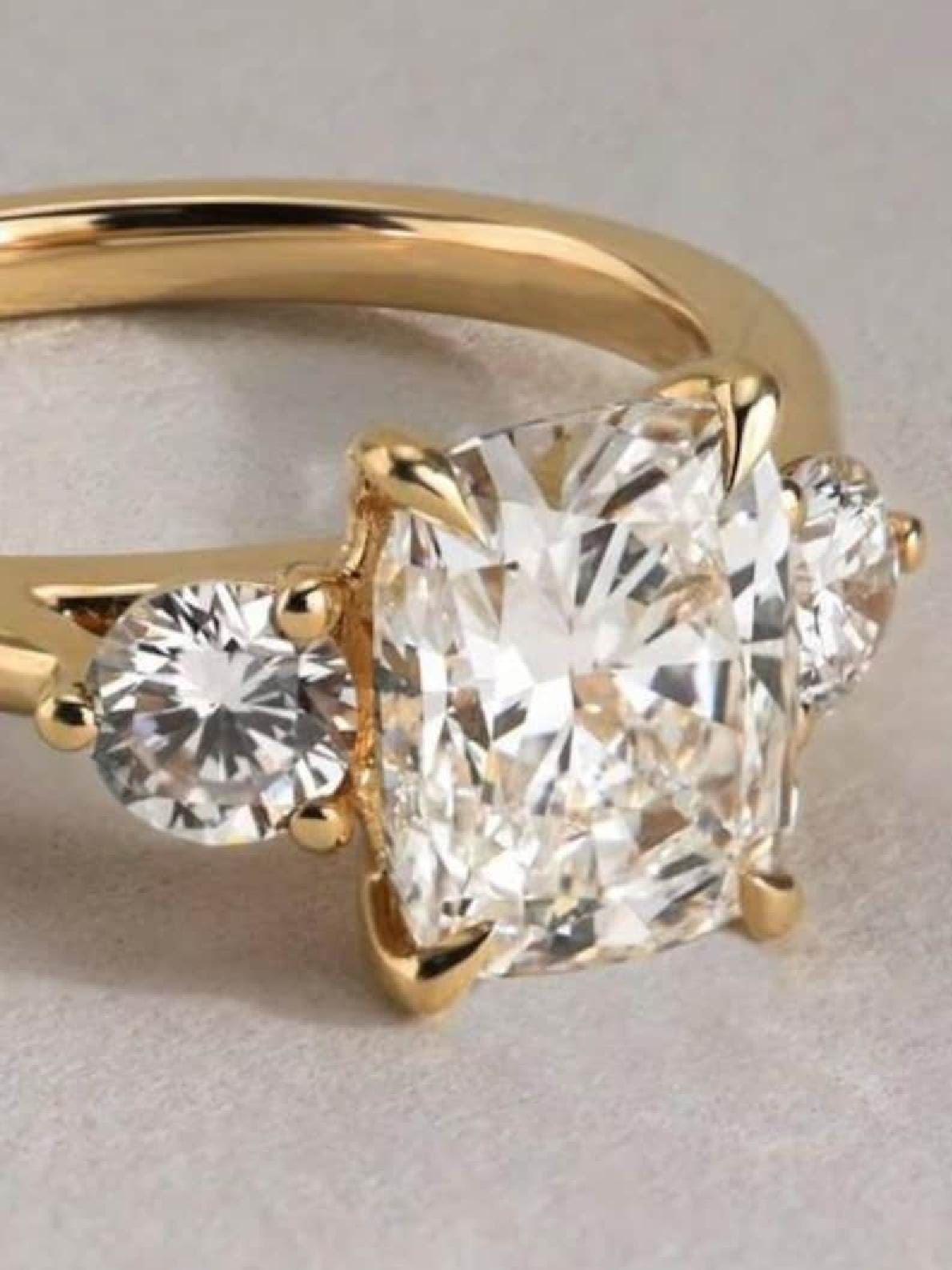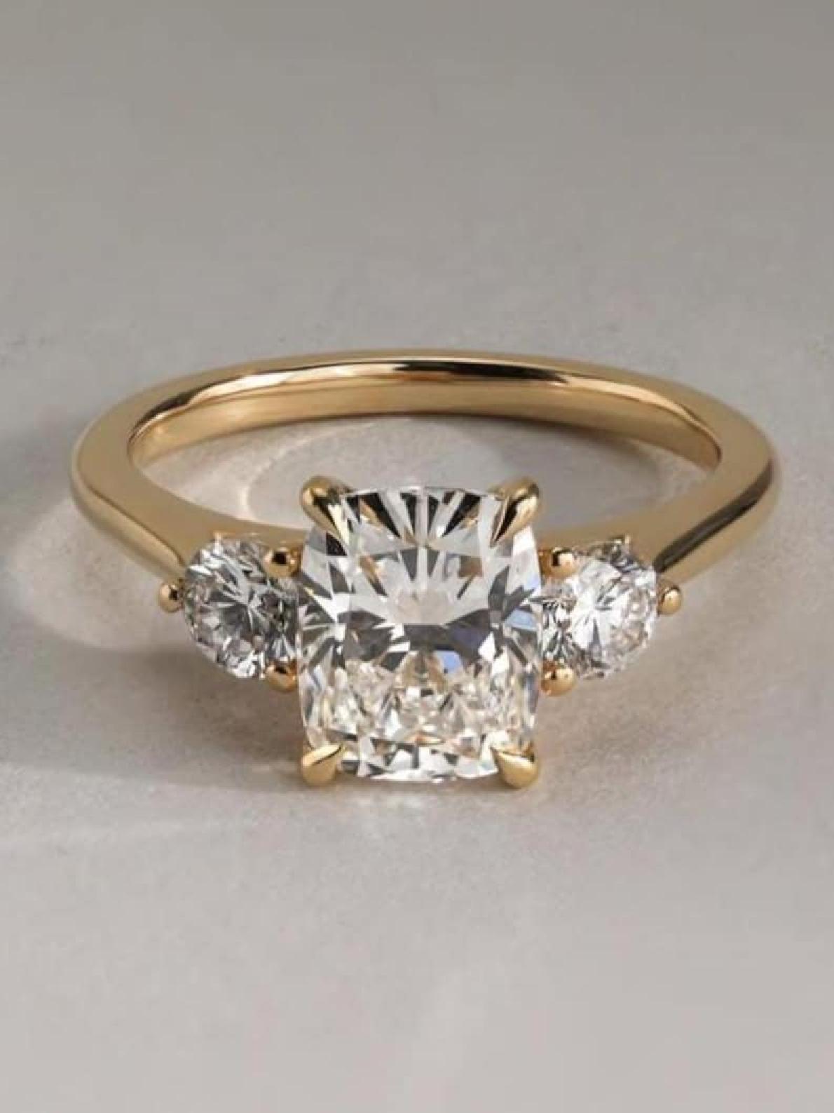 Set in warm gold, the elongated cushion cut enhances finger coverage while delivering soft, radiant sparkle. The meaningful three-stone setting symbolizes your past, present, and future, making this ring a perfect choice for engagements, weddings, anniversaries, or a thoughtful gift for her. ✨