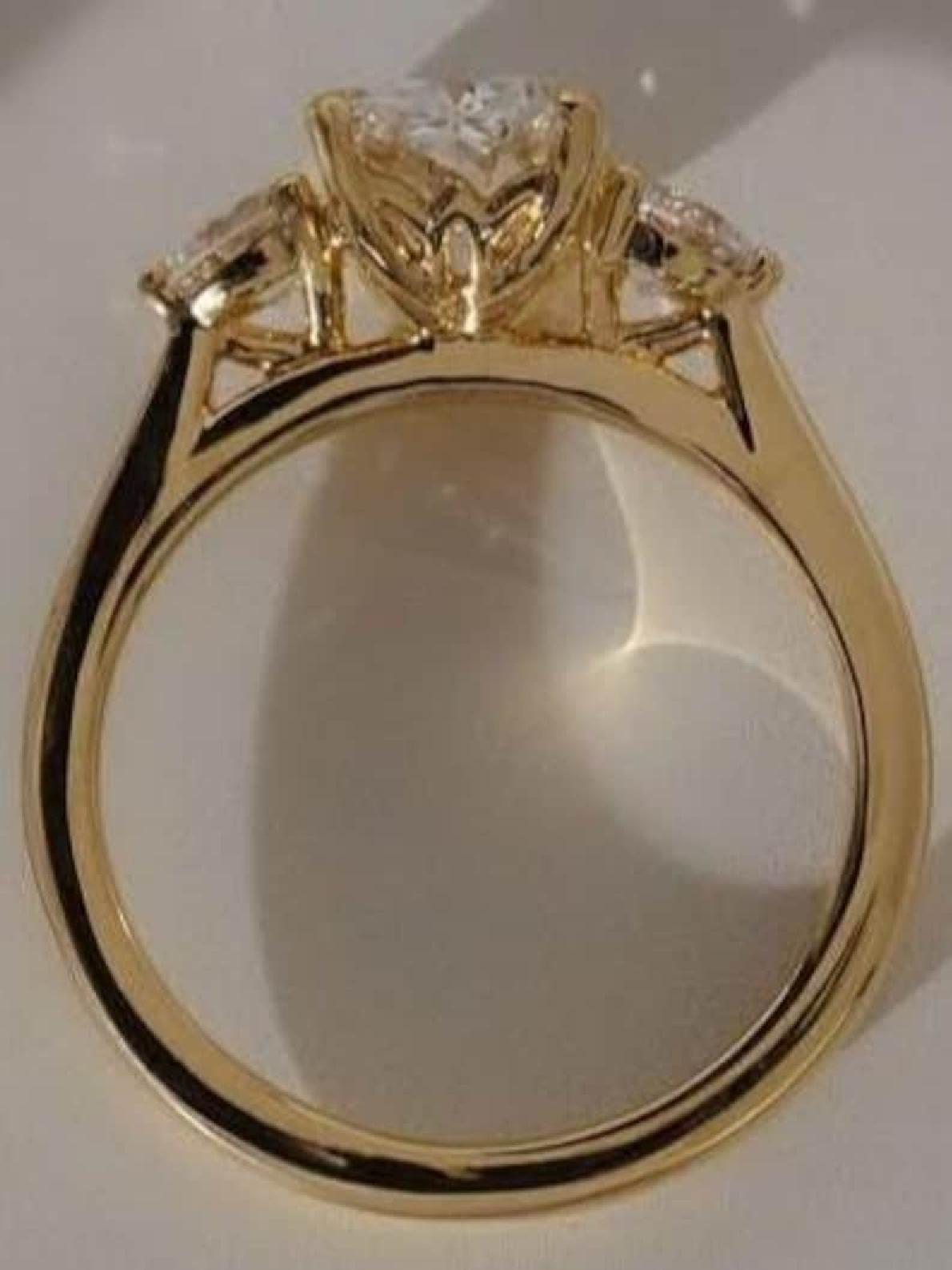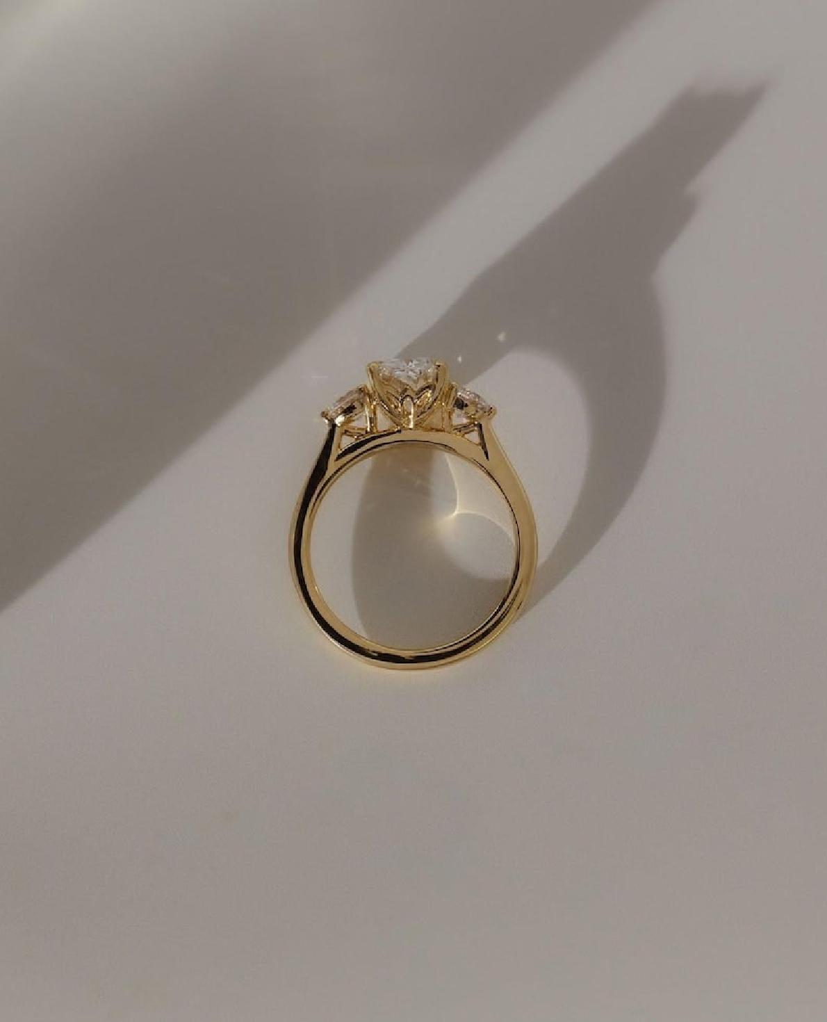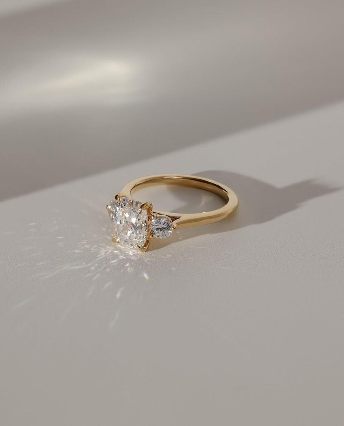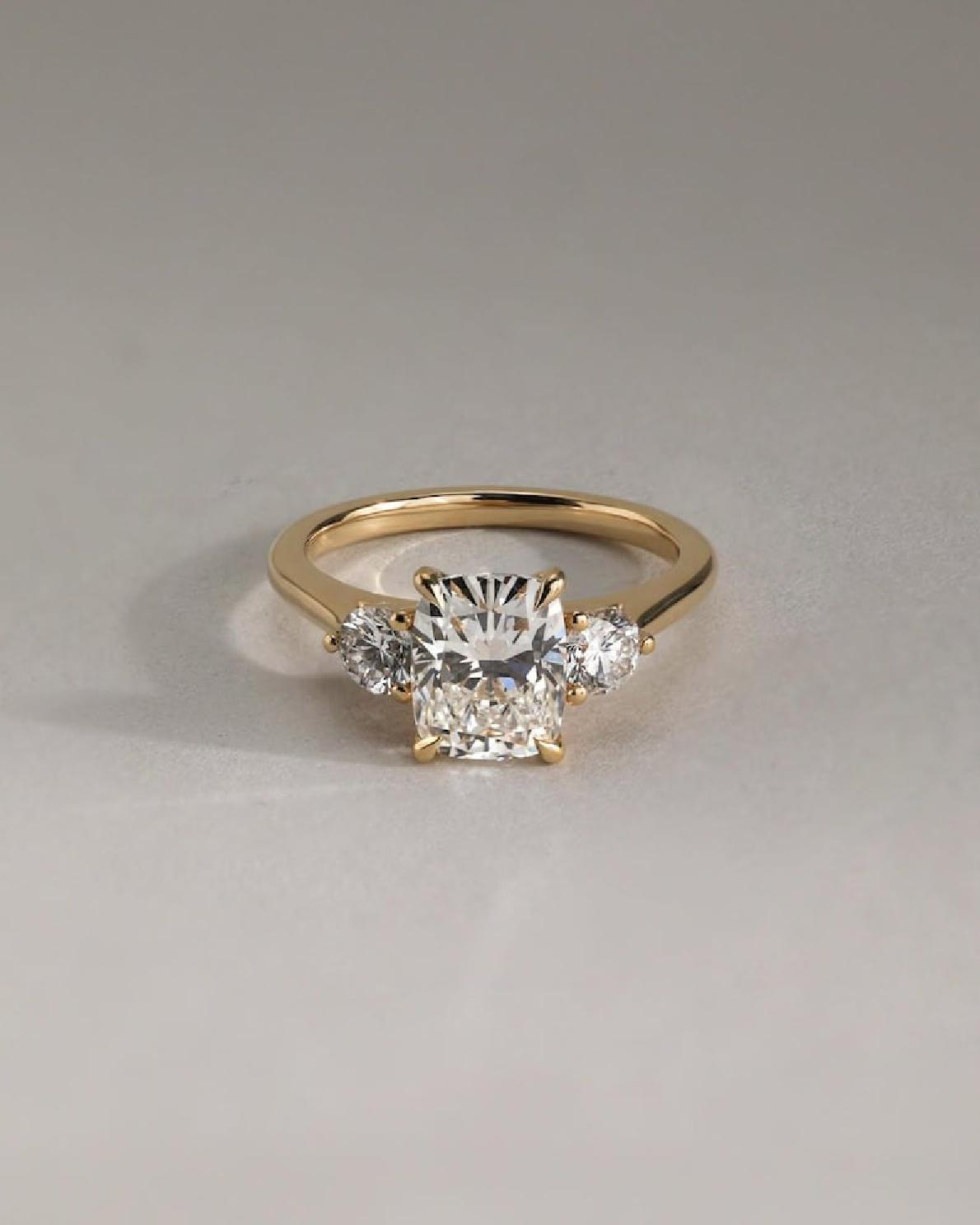 Set in warm gold, the elongated cushion cut enhances finger coverage while delivering soft, radiant sparkle. The meaningful three-stone setting symbolizes your past, present, and future, making this ring a perfect choice for engagements, weddings, anniversaries, or a thoughtful gift for her. ✨