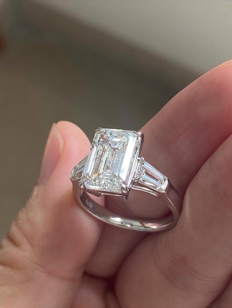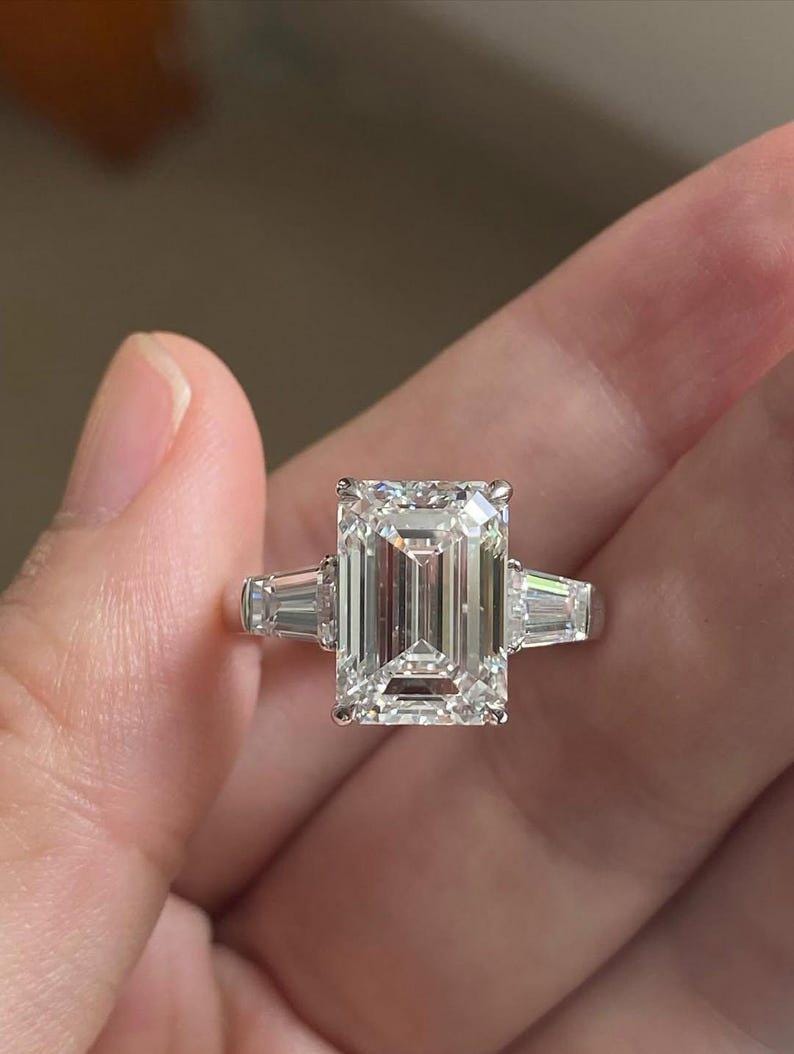 5 CT Emerald Cut Moissanite Diamond Engagement Ring, Baguette Side Stone, Modern Classic Design , Custom Made Engagement Or Anniversery Ring
