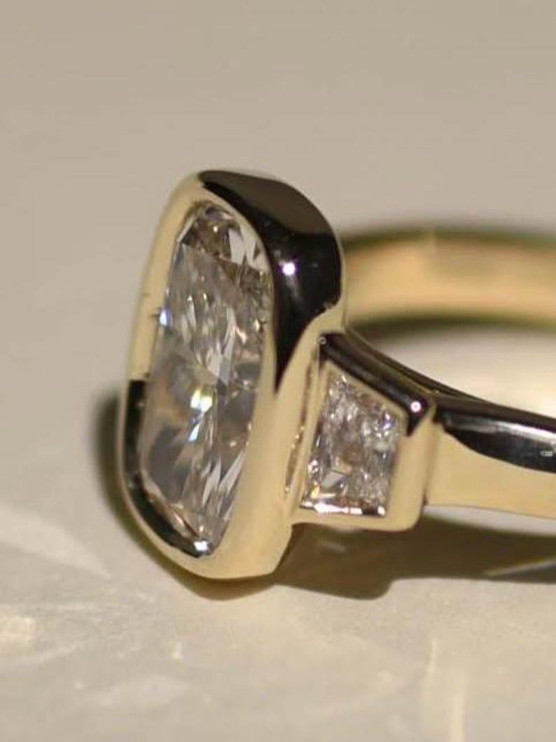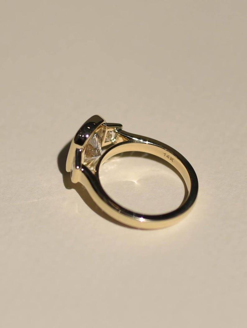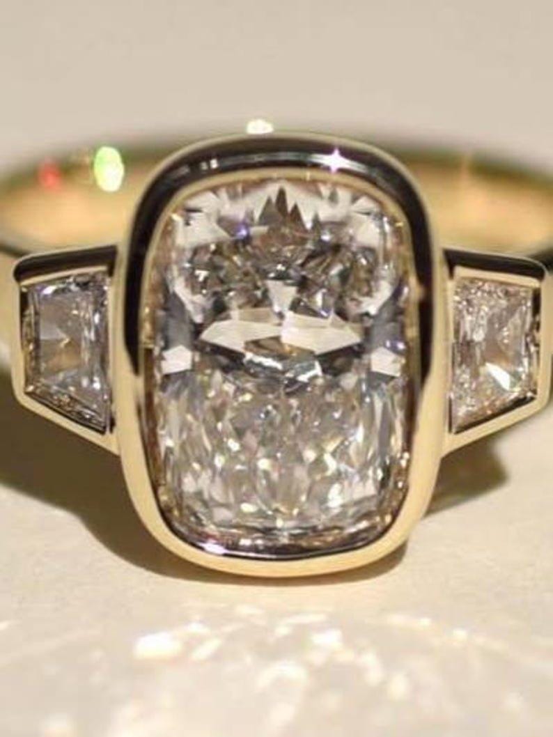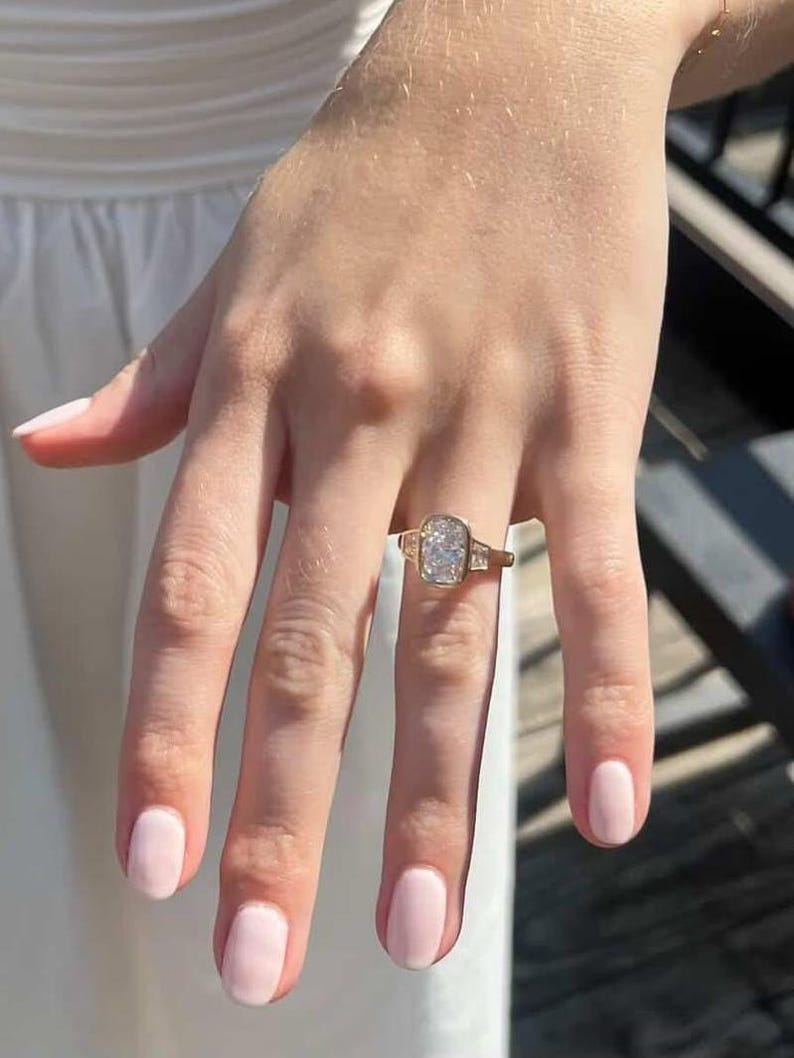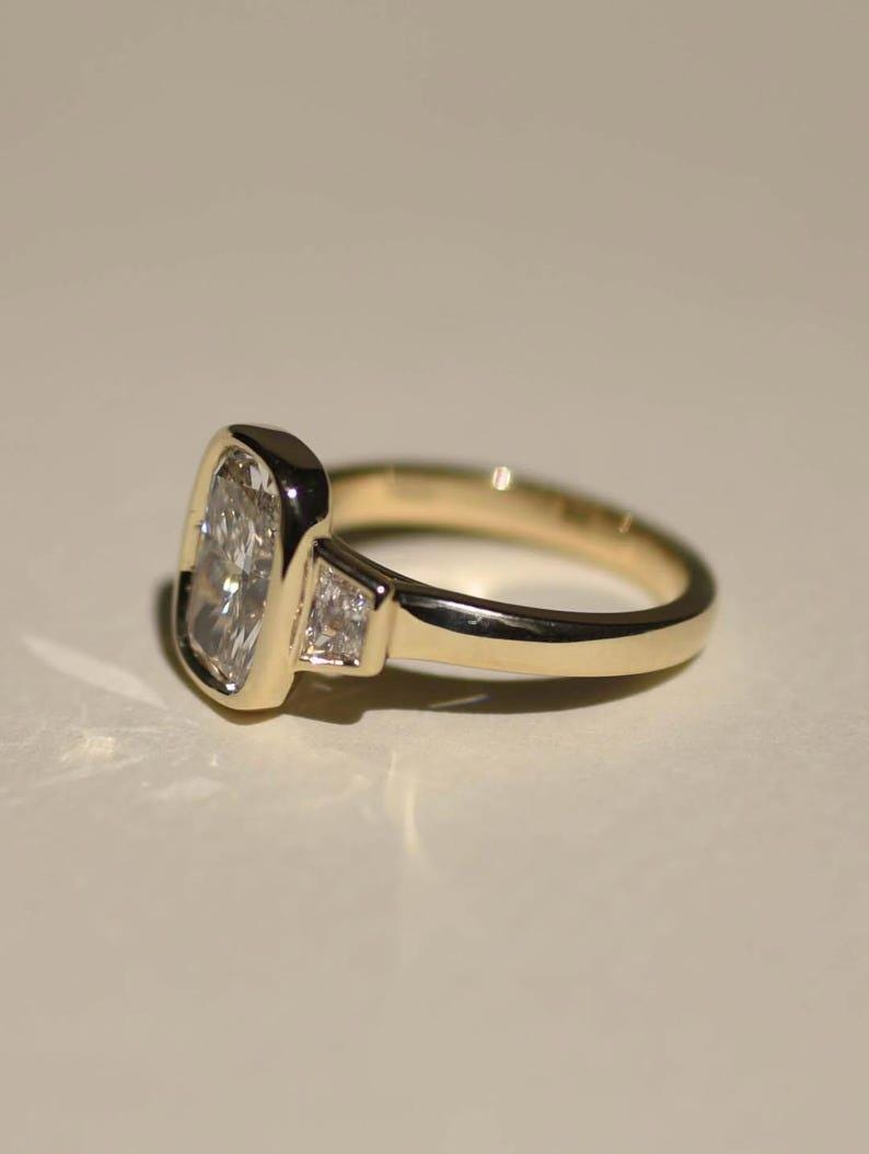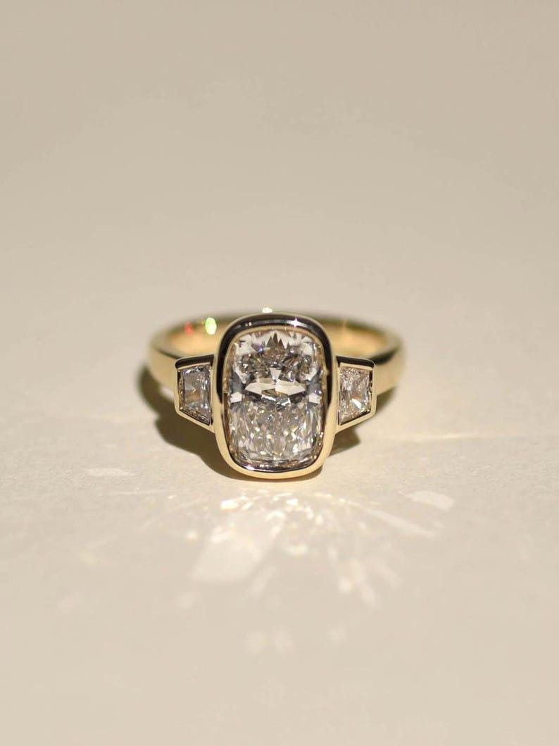 Featuring a stunning cushion-cut center diamond in a sleek 14K gold bezel setting, this ring blends vintage charm with modern sophistication. Sparkling baguette side diamonds add refined brilliance and architectural beauty, creating a truly unique silhouette.