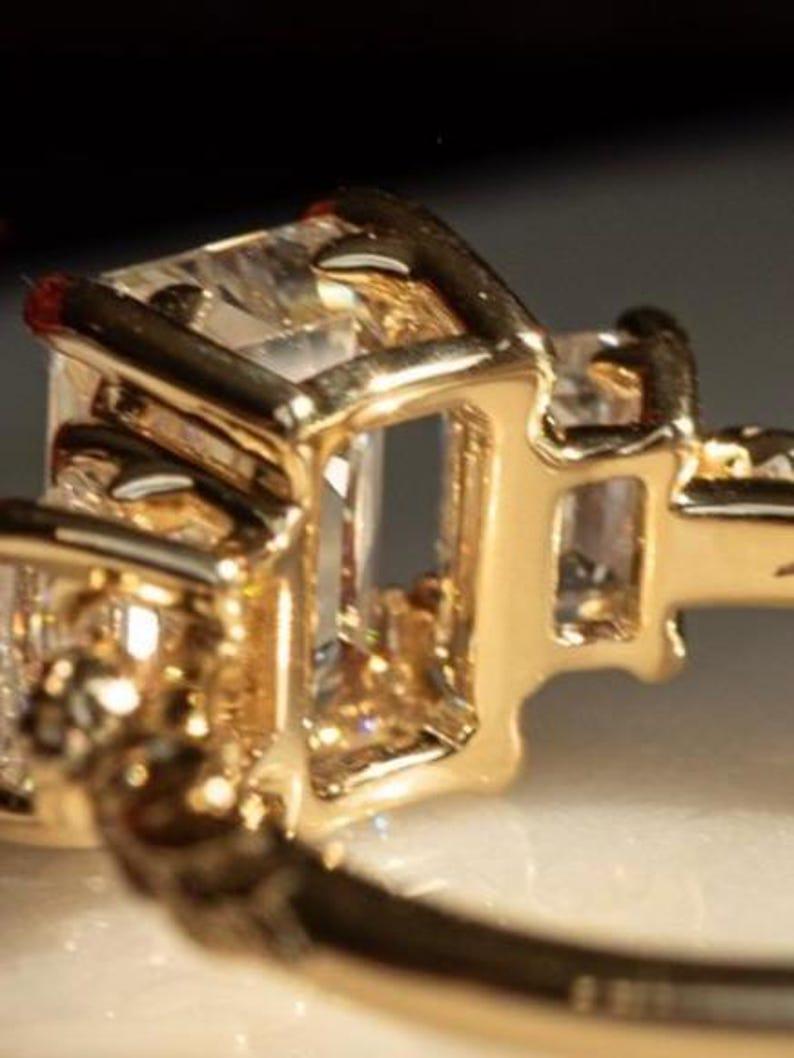 The clean lines of the emerald cut create a striking contrast against the delicate floral motifs, while the three-stone setting symbolizes your past, present, and future together. Crafted in gold and designed for lasting beauty, this ring offers exceptional brilliance, durability, and timeless appeal.