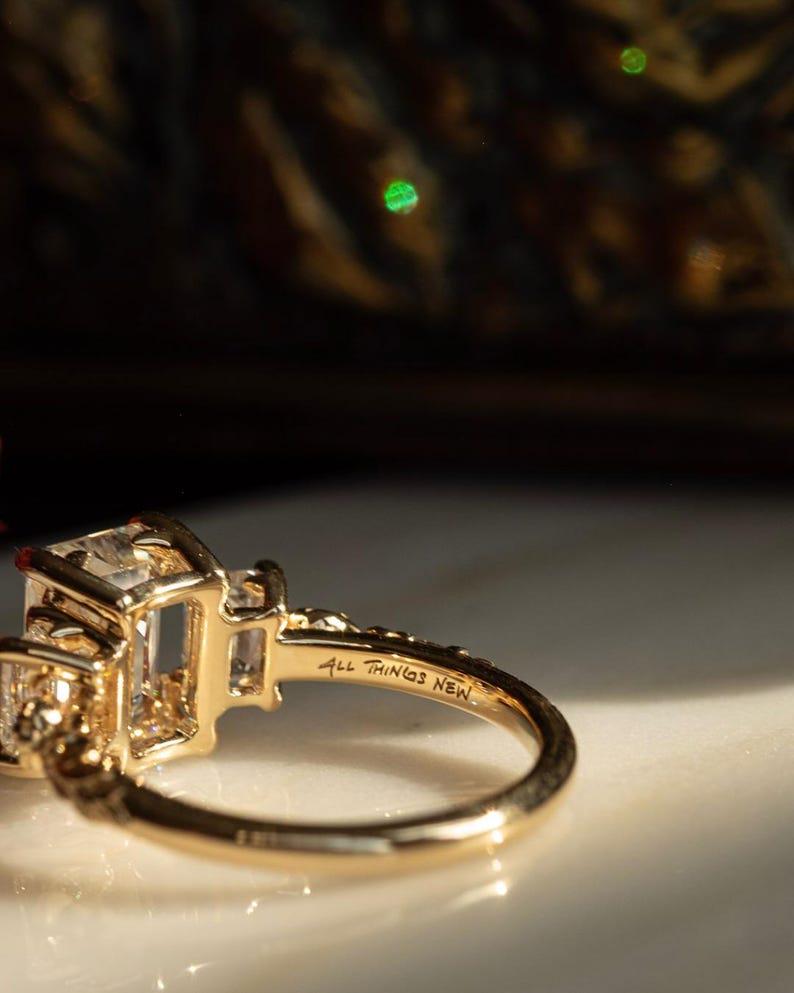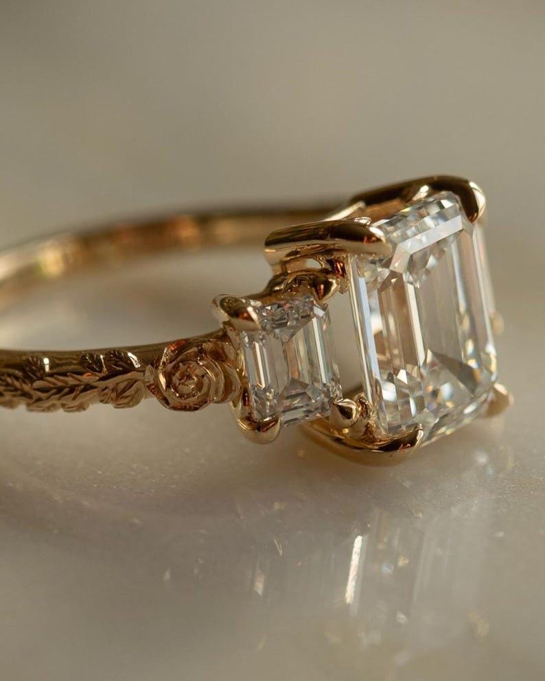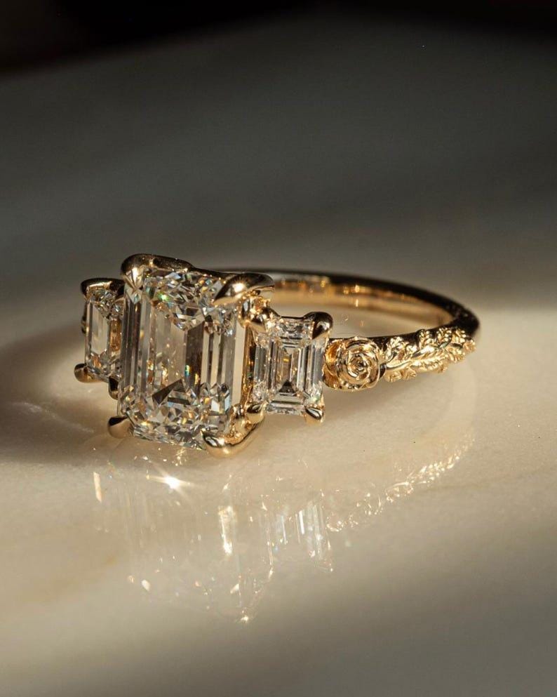 Featuring a luminous emerald-cut center moissanite flanked by two sparkling side stones, this three-stone gold ring is beautifully accented with intricate floral detailing along the band, adding a touch of vintage-inspired charm.