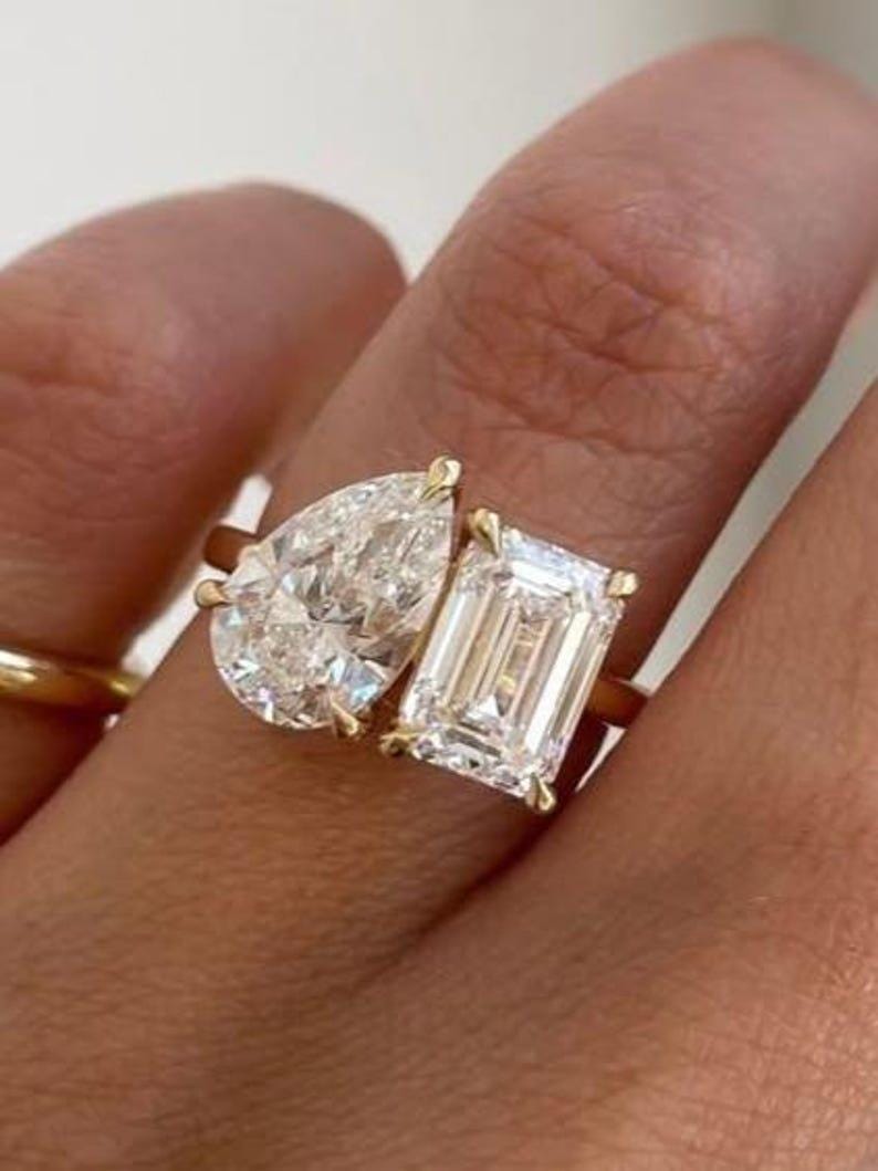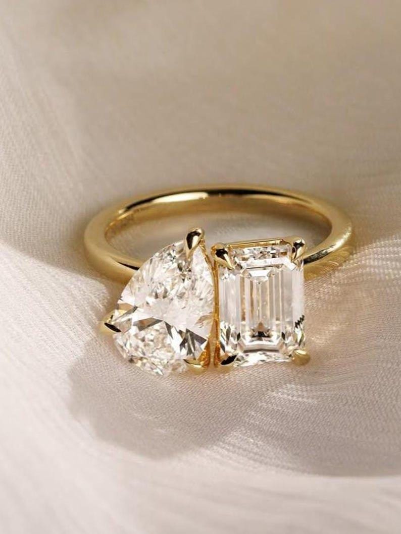5 CT Yellow Gold Toi Et Moi Engagement Ring | Pear and Emerald Cut Moissanite | Vintage Two-Stone Ring | Unique Bridal Jewelry