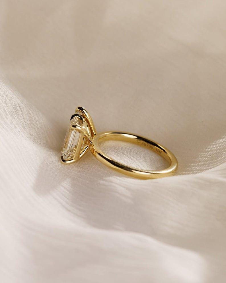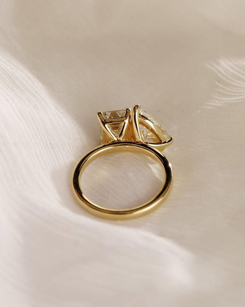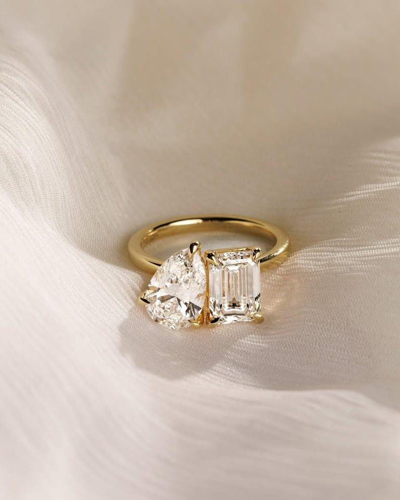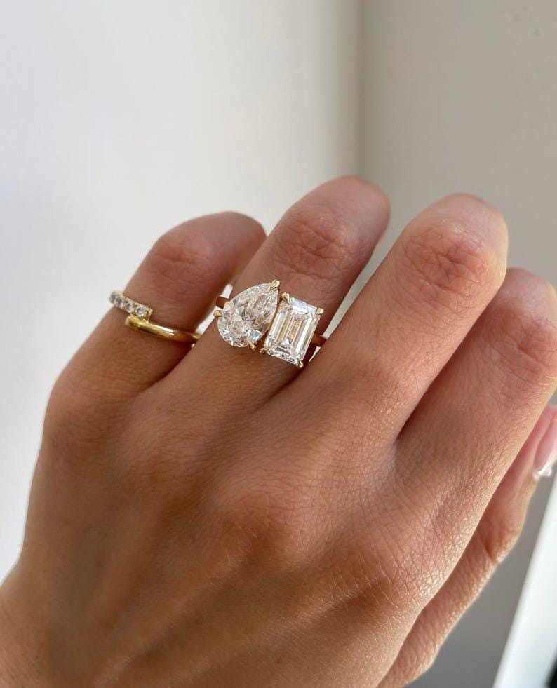 Featuring a captivating pear-cut and emerald-cut moissanite set side by side, this elegant two-stone design symbolizes two souls united as one. The contrast between the soft curves of the pear cut and the clean lines of the emerald cut creates a beautifully balanced and eye-catching look.
