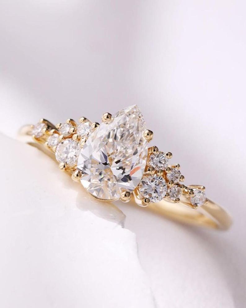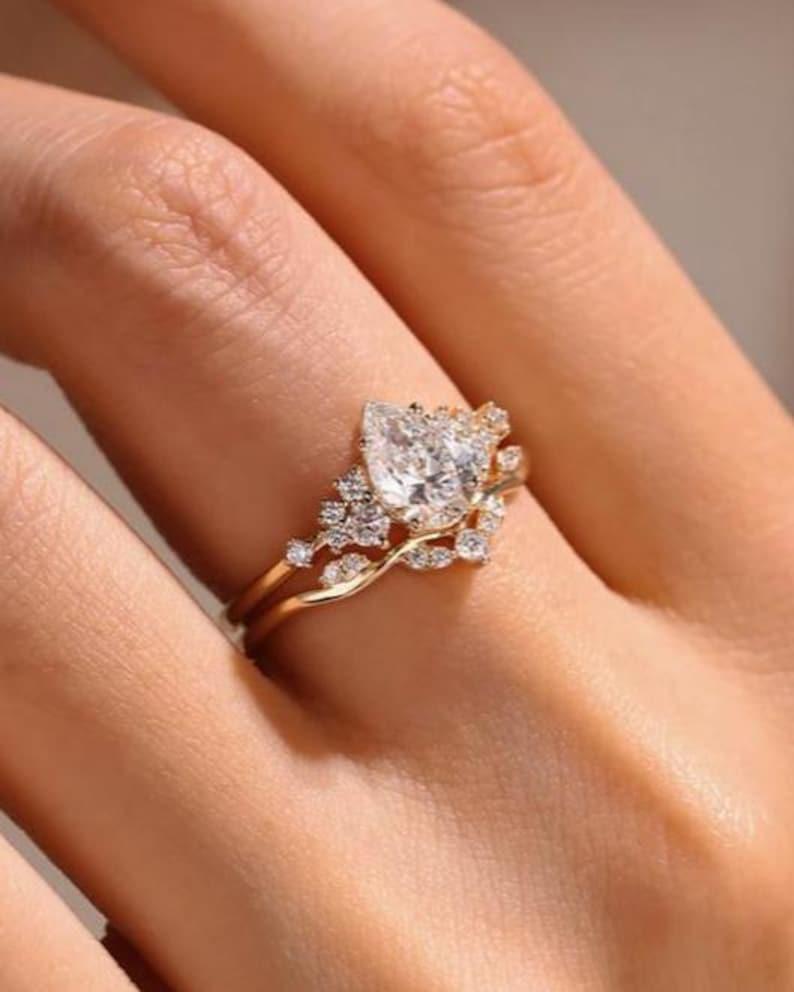 The pear cut offers graceful brilliance and a flattering silhouette, while the yellow gold setting adds timeless charm. Perfect as an engagement ring, promise ring, or meaningful gift, this bridal set symbolizes love, commitment, and personal style.