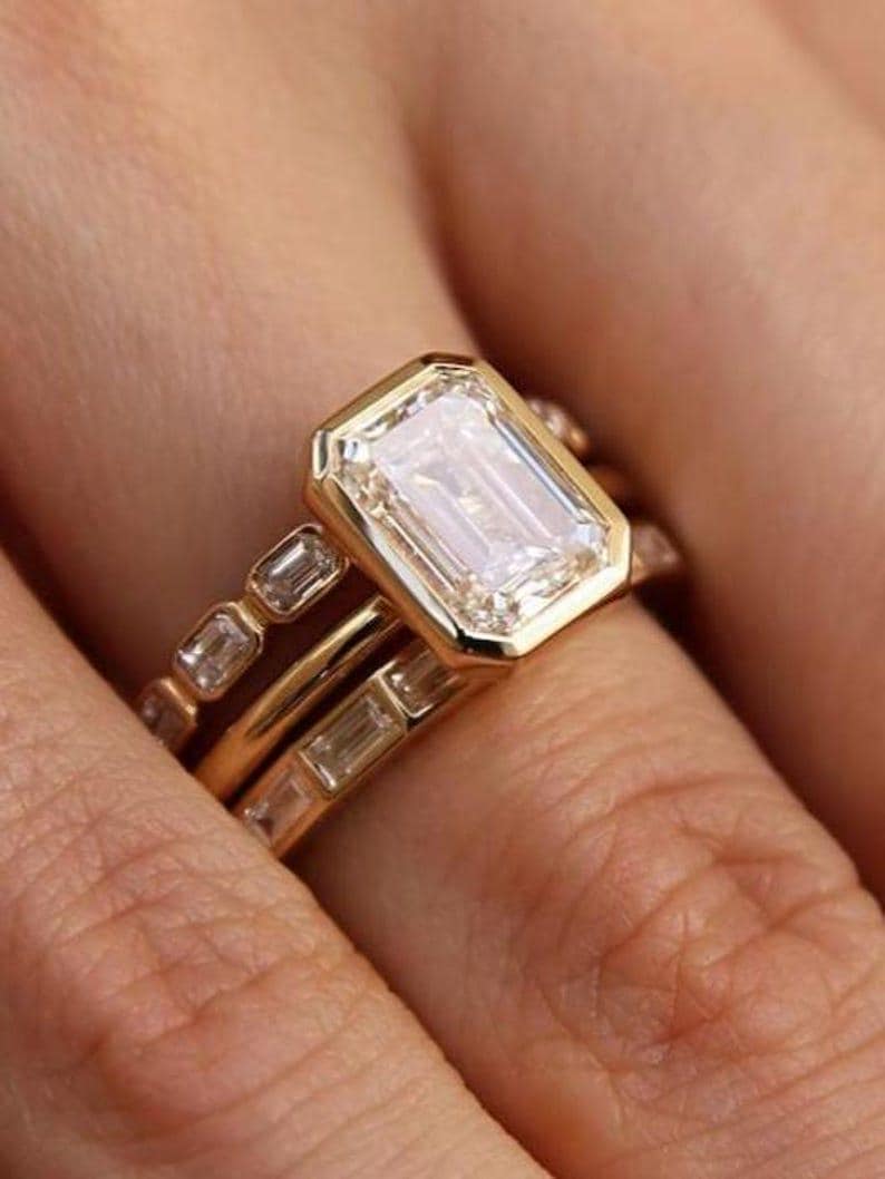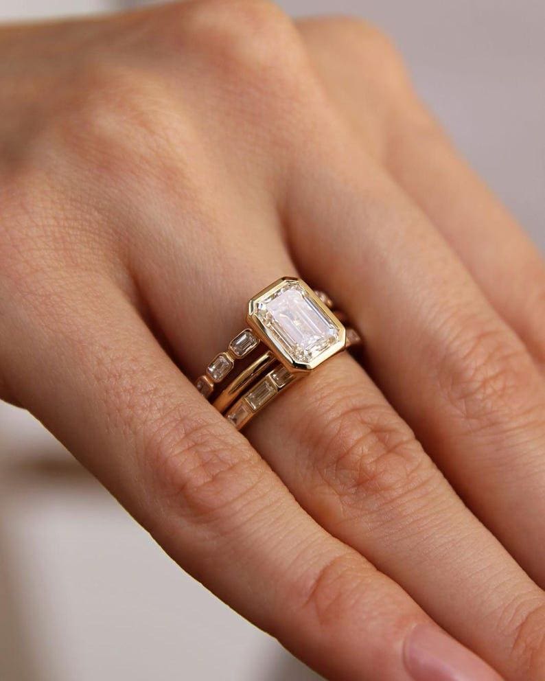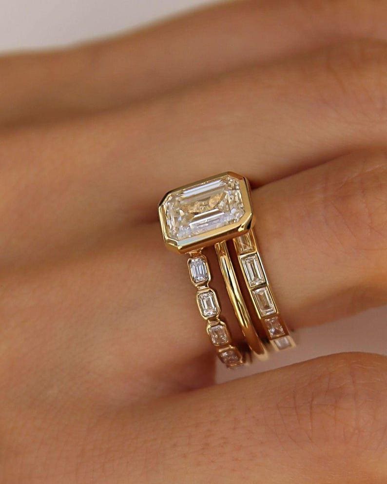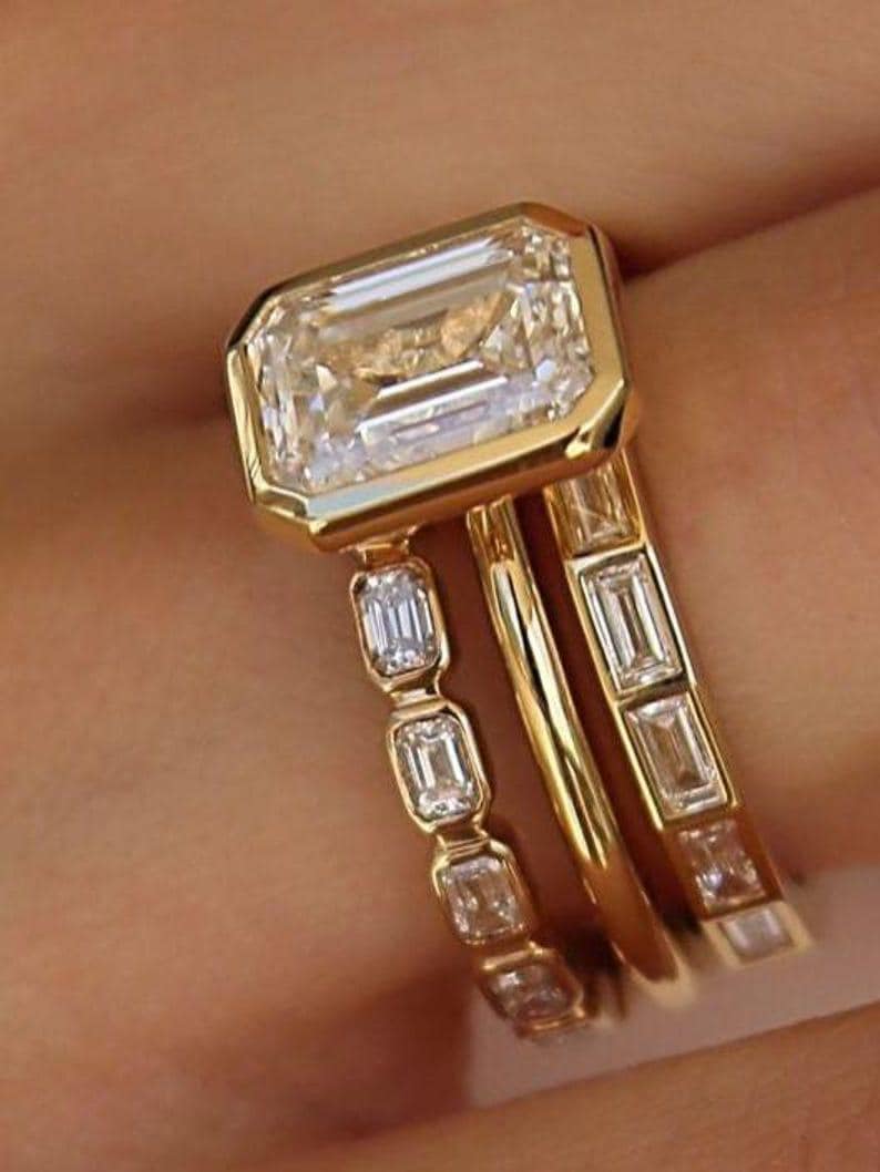 2 Carat Emarald Cut Moissanite Ring With Contour Bands, 3 Piece Bridal Sets In Gold Engagement and Wedding Ring Gift For Her