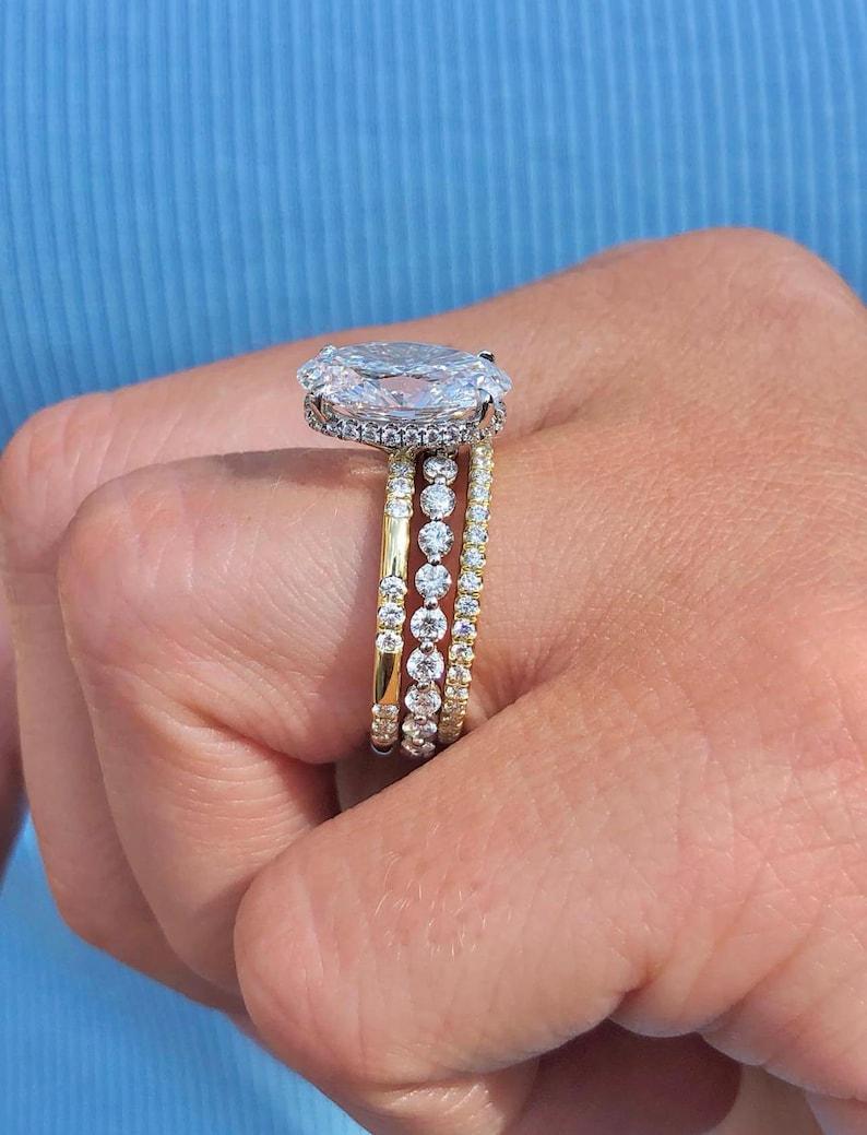 The oval cut offers a graceful, elongated silhouette that flatters the finger, while the hidden halo adds subtle brilliance and depth without overwhelming the design. The matching gold diamond bands enhance sparkle and balance, making this multi-piece wedding ring set both luxurious and comfortable for everyday wear.
