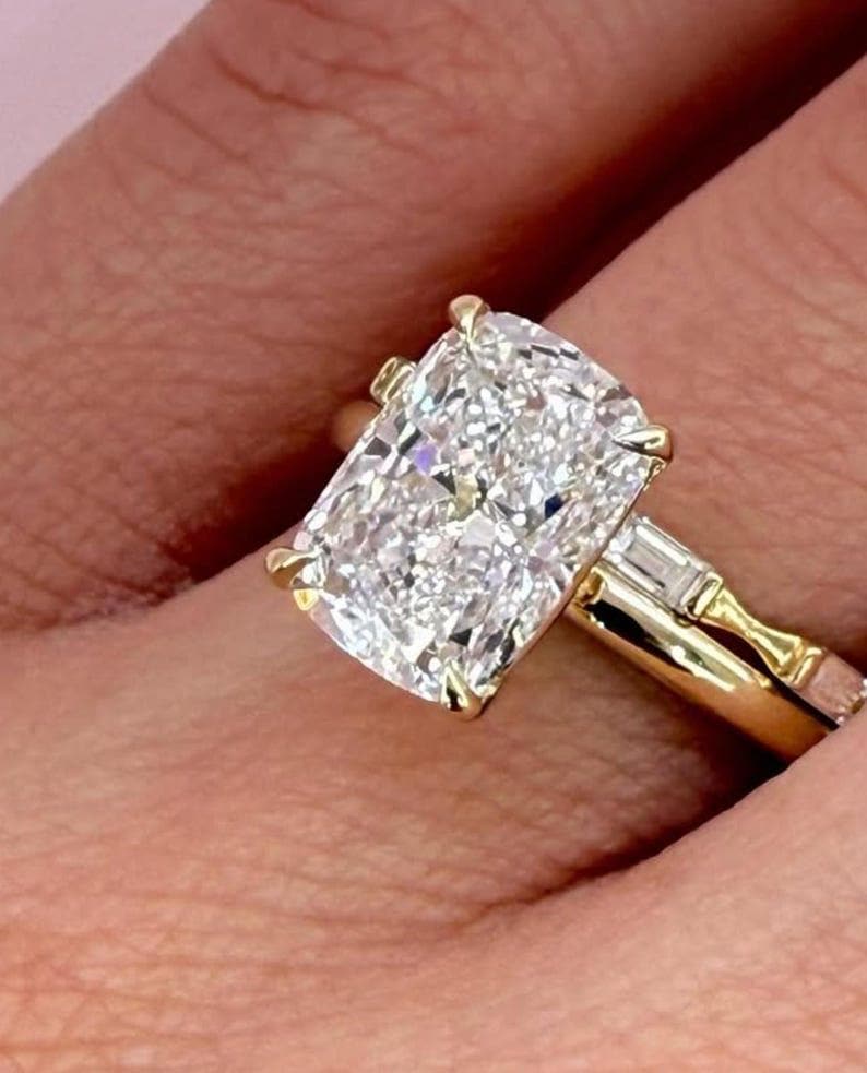 2.50 CT Cushion Cut Moissanite Engagement Ring | Baguette Side Stone | Luxury Vintage Style Promise Ring | Classic And Modern Jewelry