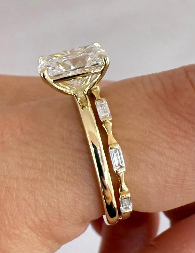 Featuring a radiant cushion-cut moissanite center stone, this ring is beautifully accented with baguette side stones that add structure, symmetry, and refined brilliance.