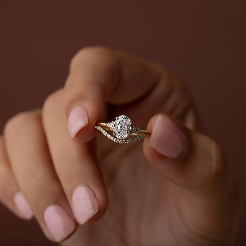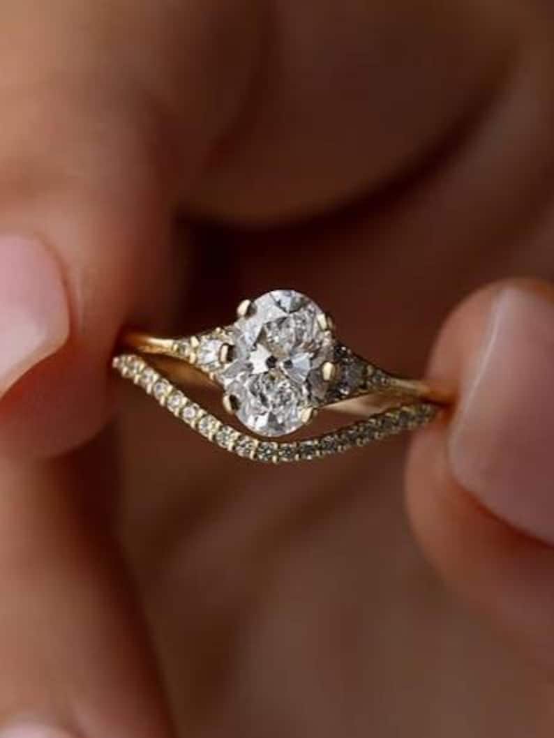 Featuring a brilliant oval-cut moissanite engagement ring paired with beautifully coordinated Art Deco–inspired matching bands, this bridal set blends old-world charm with modern brilliance.