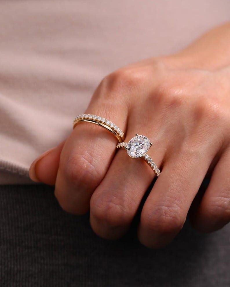 Featuring a radiant oval-cut moissanite engagement ring paired with two perfectly matching solid gold bands, this three-ring set creates a complete and harmonious bridal look ideal for weddings and anniversaries.