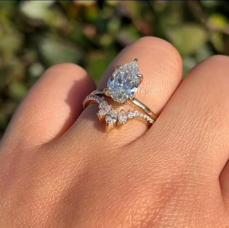 Featuring a brilliant pear-cut moissanite engagement ring paired with a beautifully coordinated diamond-accented wedding band, this bridal set blends timeless beauty with modern sophistication.