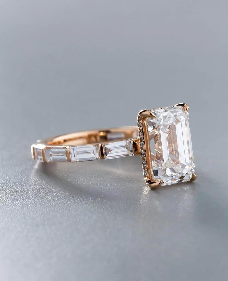 Rose Gold 3 CT Emerald Cut Moissanite Ring | Baguette Diamond Band | Vintage Style Engagement Ring | Wedding Ring | Gift For Her