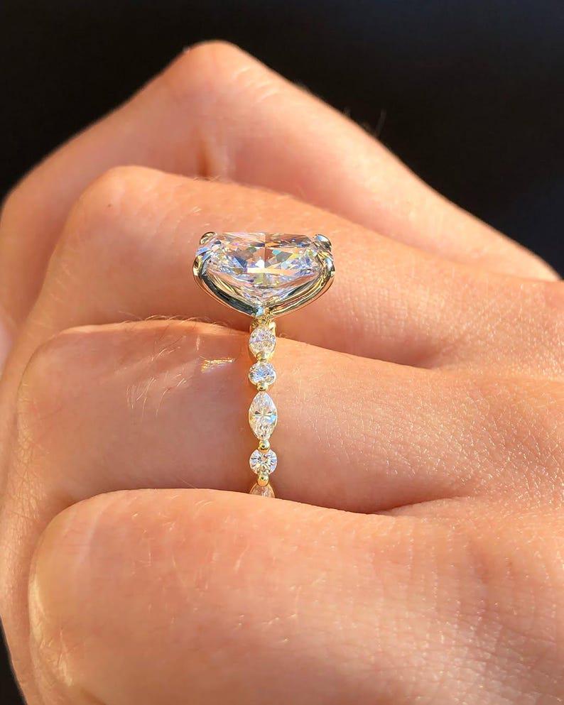 Featuring a brilliant elongated cushion-cut moissanite center stone, this ring offers exceptional fire and sparkle while creating a graceful, finger-lengthening silhouette. The elongated cushion cut combines soft curves with radiant brilliance, making it both classic and eye-catching.