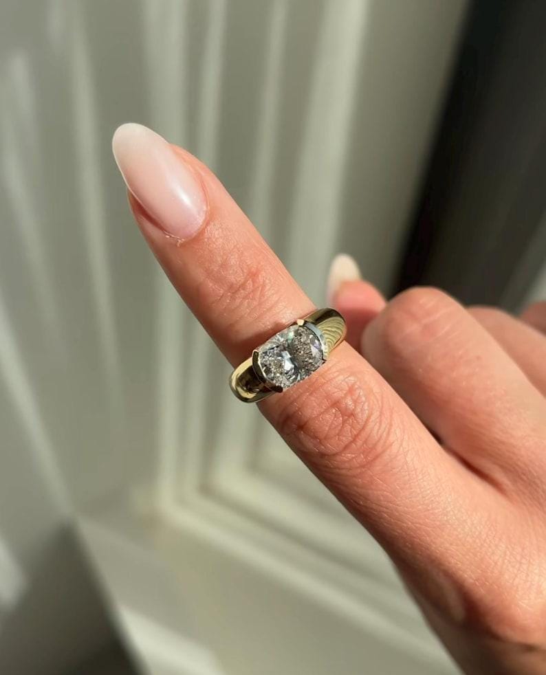 Featuring a dazzling Forever One cushion-cut moissanite, this ring delivers exceptional brilliance, fire, and clarity that rivals the beauty of a diamond. The softly rounded cushion cut blends classic charm with modern sparkle, creating a warm and captivating glow.