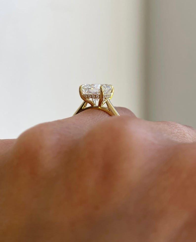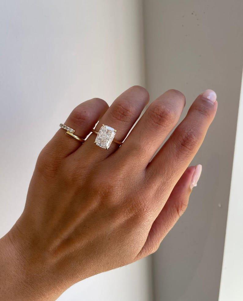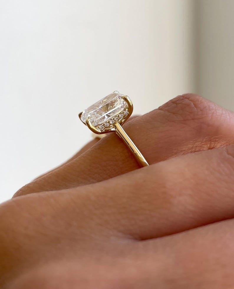 Featuring a luminous crushed ice–cut cushion moissanite center stone, this ring sparkles with a soft, icy shimmer and exceptional depth. The elongated cushion shape enhances the finger with a graceful, flattering silhouette while delivering dazzling fire from every angle.
