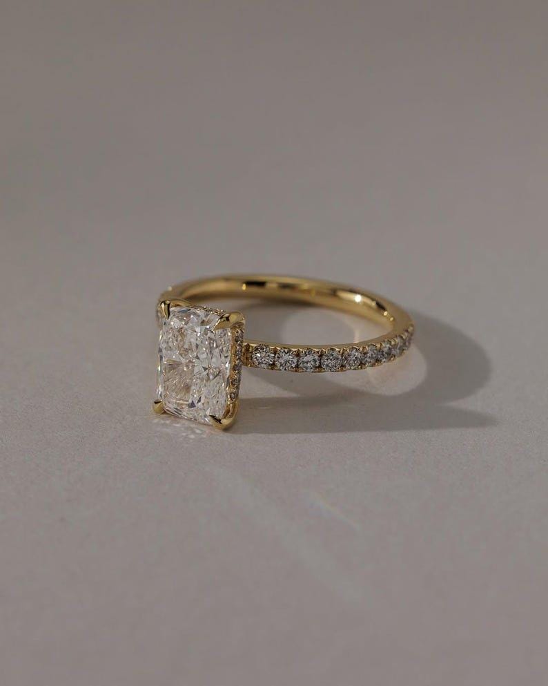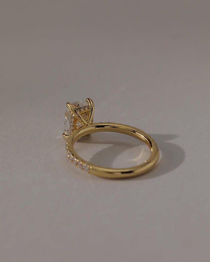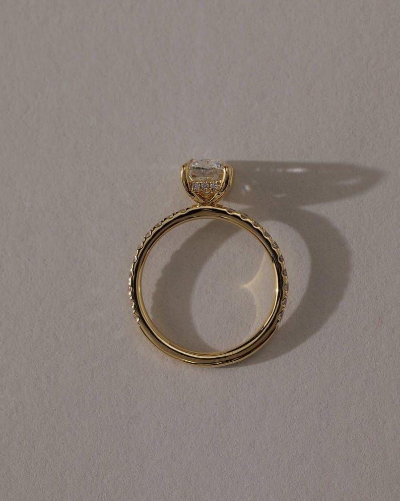 A delicate hidden halo of diamonds rests beneathsafe the center stone, adding a subtle layer of shimmer that enhances brilliance without overpowering the clean solitaire look. This thoughtful detail creates depth, dimension, and an extra touch of luxury visible from every angle.