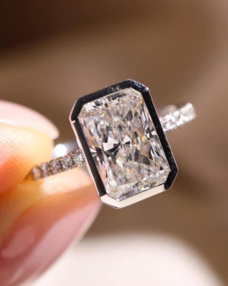 ↣ Brilliant 3 CT radiant-cut moissanite with exceptional fire and sparkle
