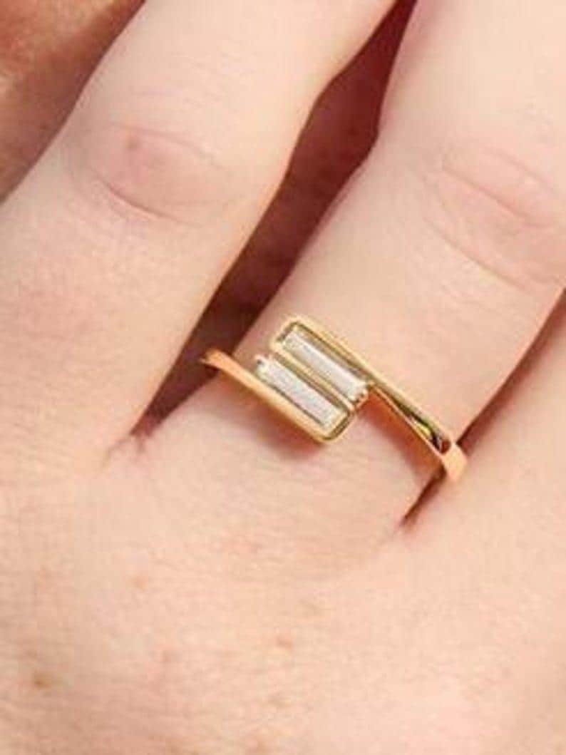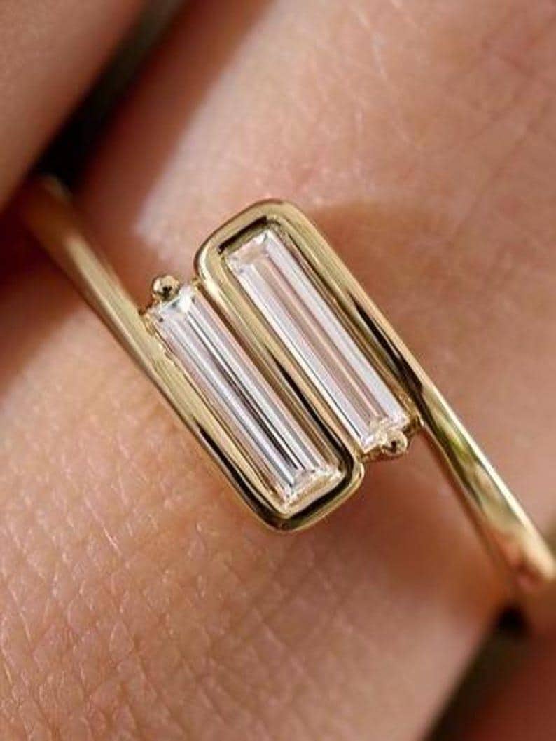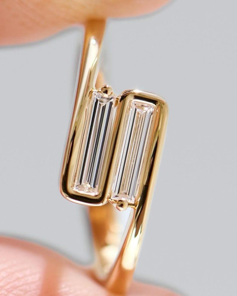 At the center of this stunning design are sleek baguette-cut moissanite stones, admired for their clean lines and refined sparkle. The step-cut facets create a subtle, mirror-like brilliance that gives the ring a sophisticated and timeless appeal.