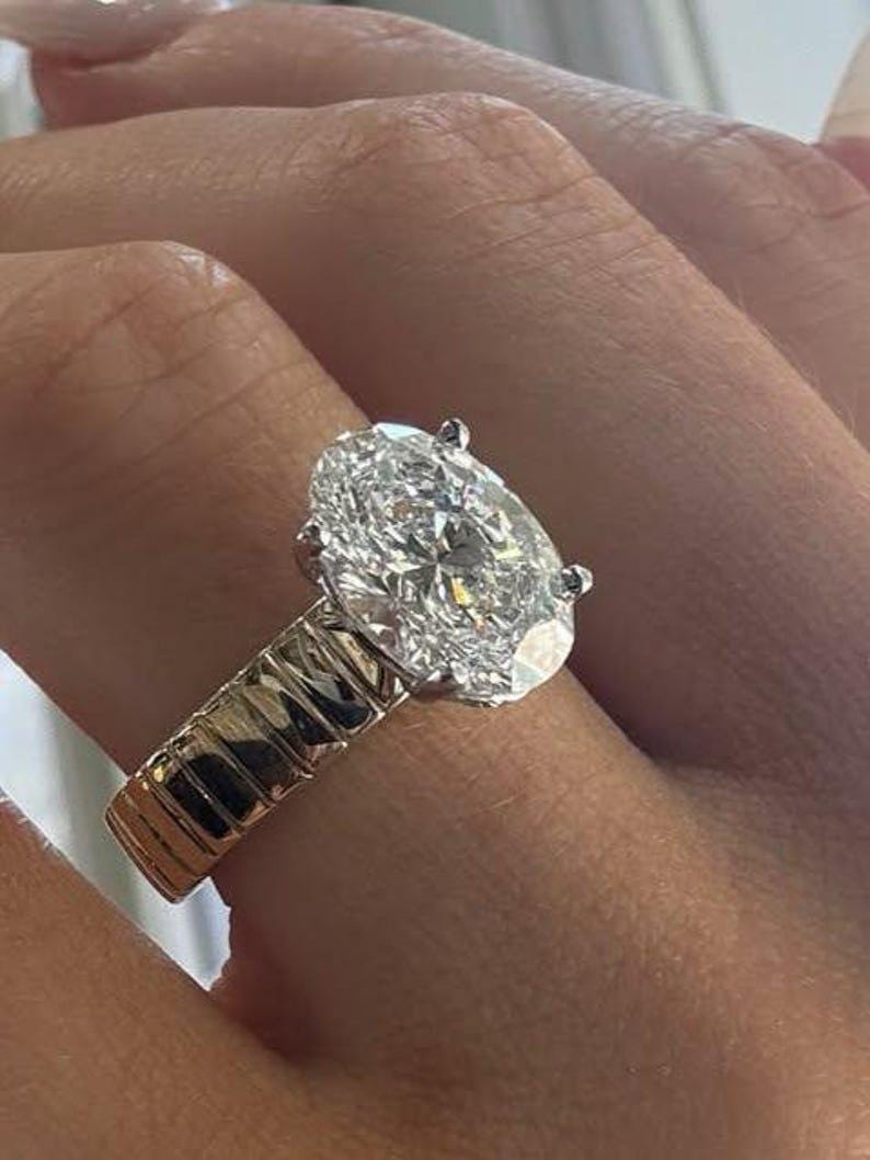 At the center of this beautiful ring is a dazzling 4 carat oval-cut moissanite, known for its exceptional sparkle and graceful elongated shape. The oval cut maximizes light reflection, creating incredible fire and brilliance while offering a flattering silhouette that enhances the beauty of the hand.