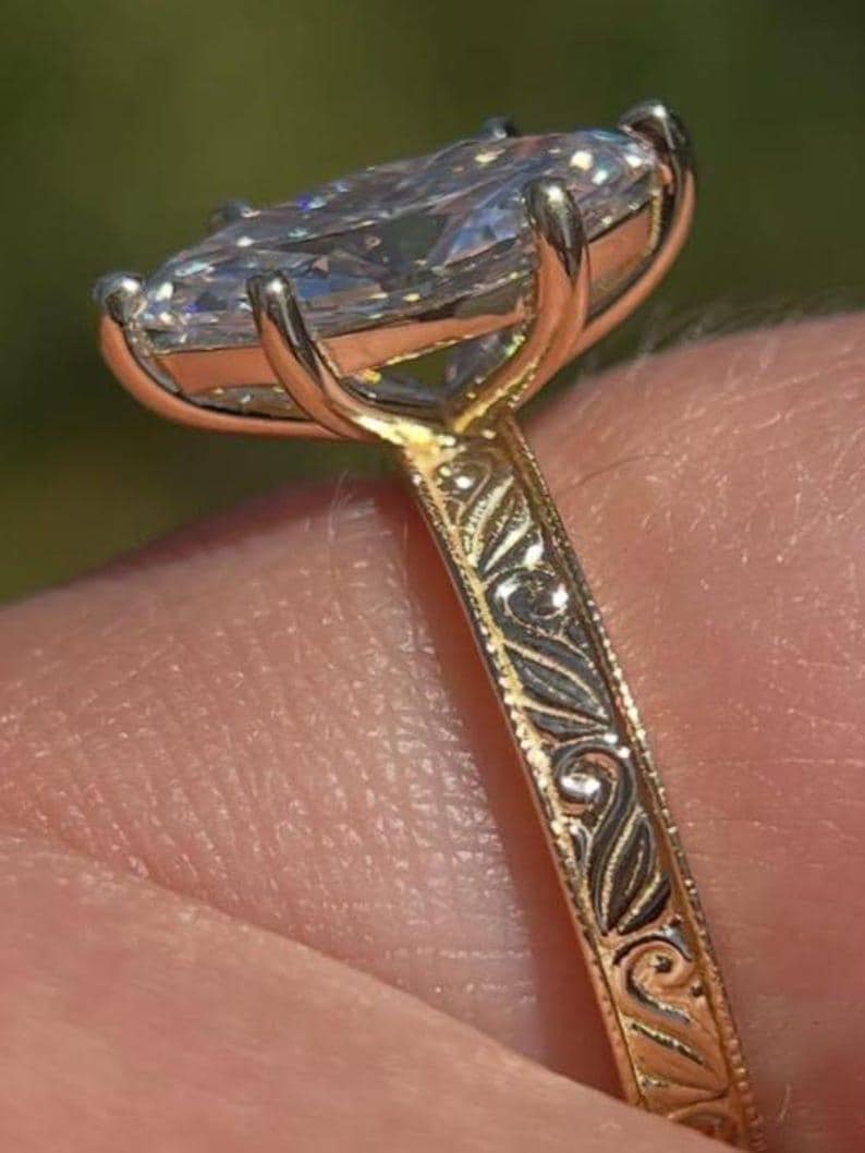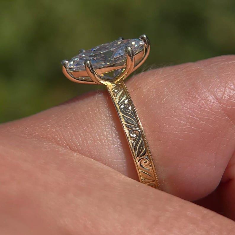 At the center of this beautiful ring is a brilliant 3 carat marquise-cut moissanite, admired for its distinctive elongated shape and exceptional sparkle. The marquise cut reflects light beautifully, creating remarkable brilliance while its pointed ends give the finger a longer, more graceful appearance.