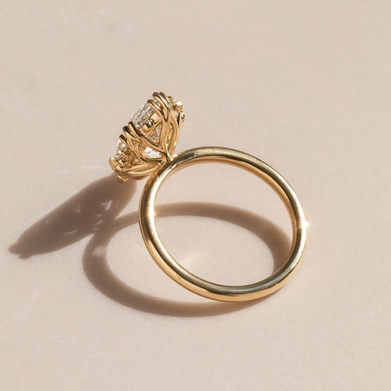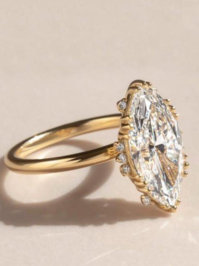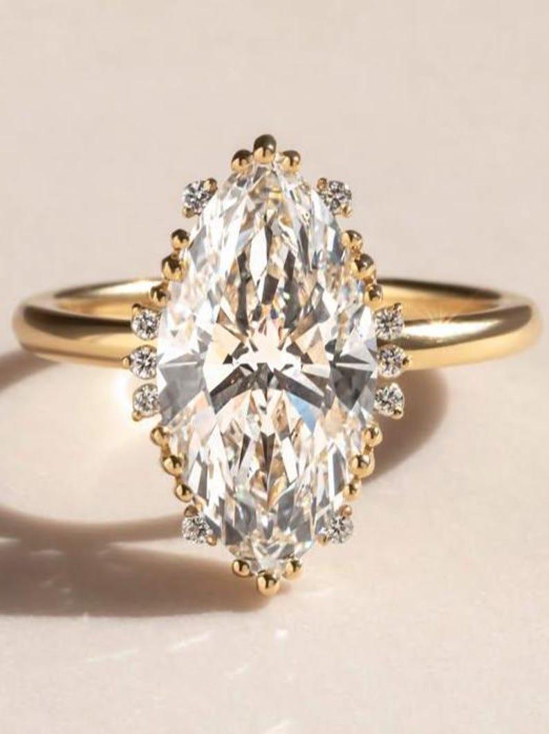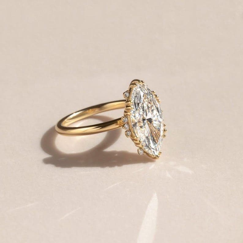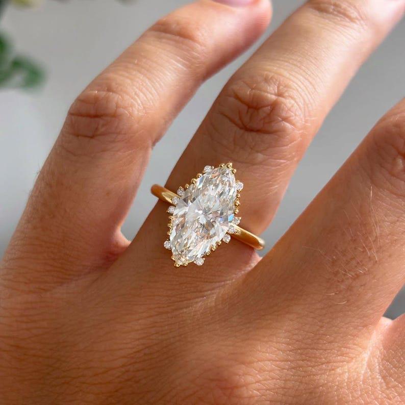 At the center of this stunning ring is a dazzling 4 carat marquise-cut moissanite, admired for its distinctive elongated silhouette and exceptional sparkle. The marquise cut reflects light beautifully while its pointed ends create a graceful look that makes the finger appear longer and more slender.
