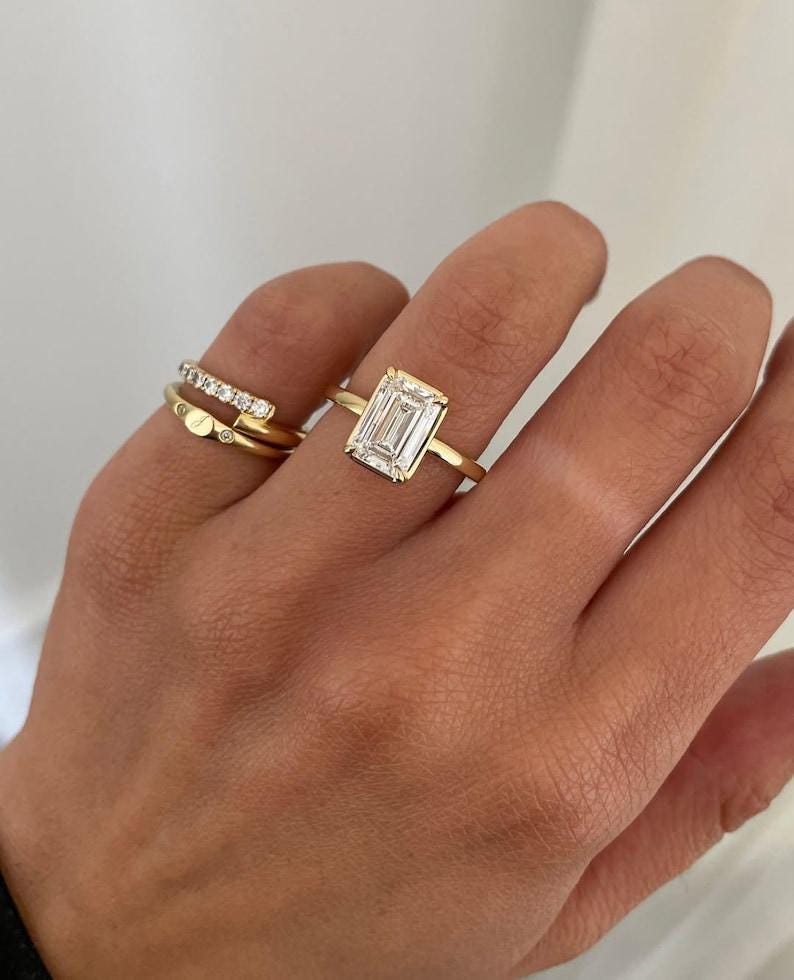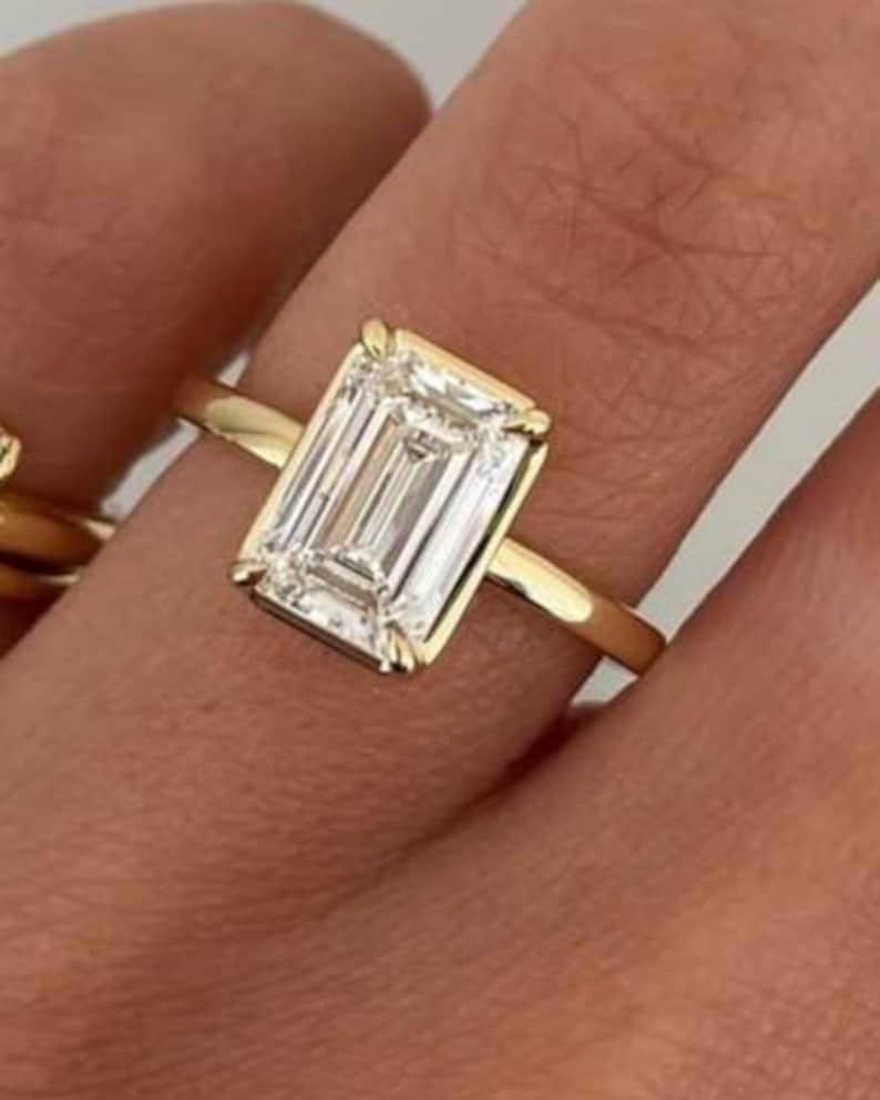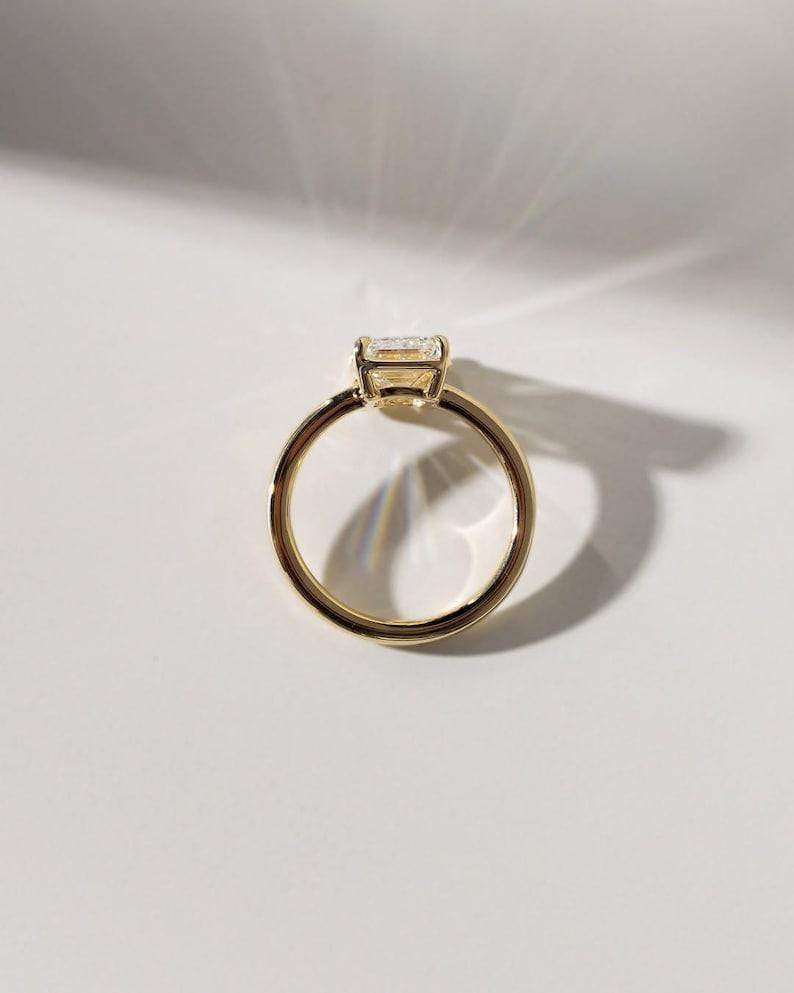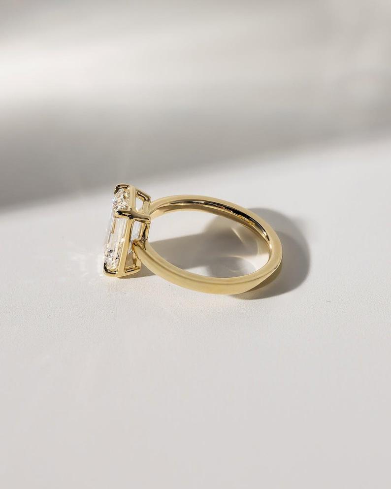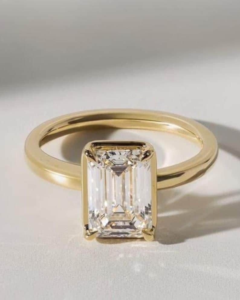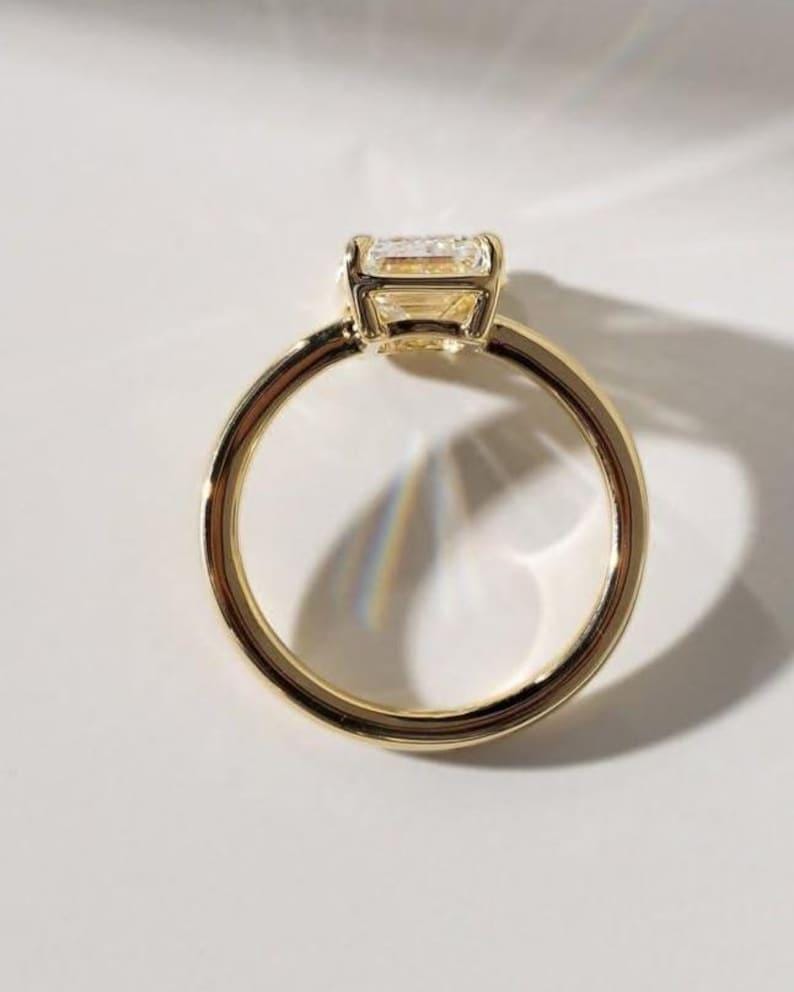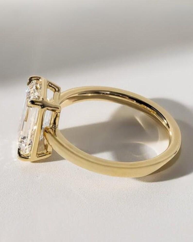 Crafted in solid gold, the band offers durability, comfort, and a luxurious finish that perfectly complements the brilliance of the center stone. The classic solitaire design keeps the focus on the emerald-cut moissanite, allowing its beauty and clarity to shine from every angle.
