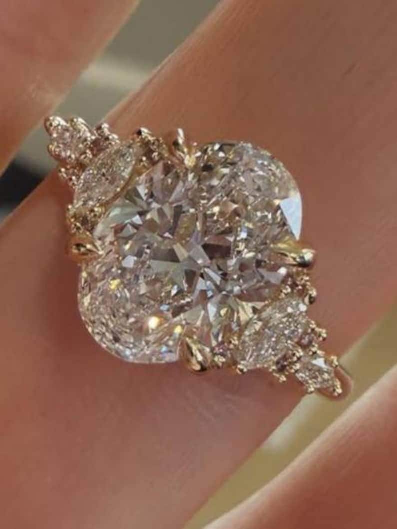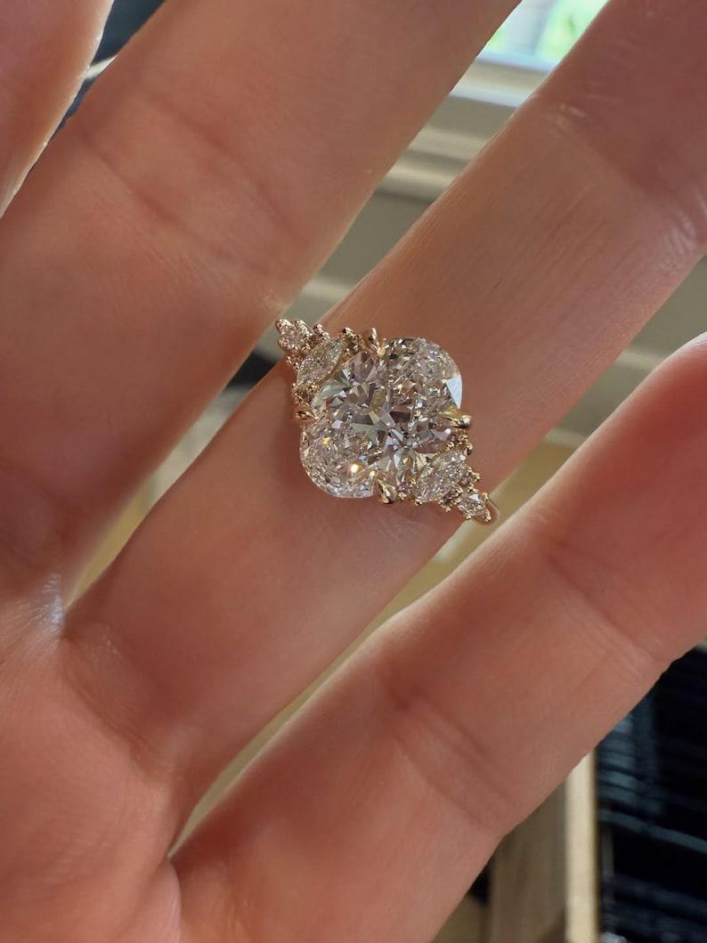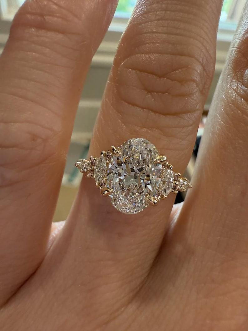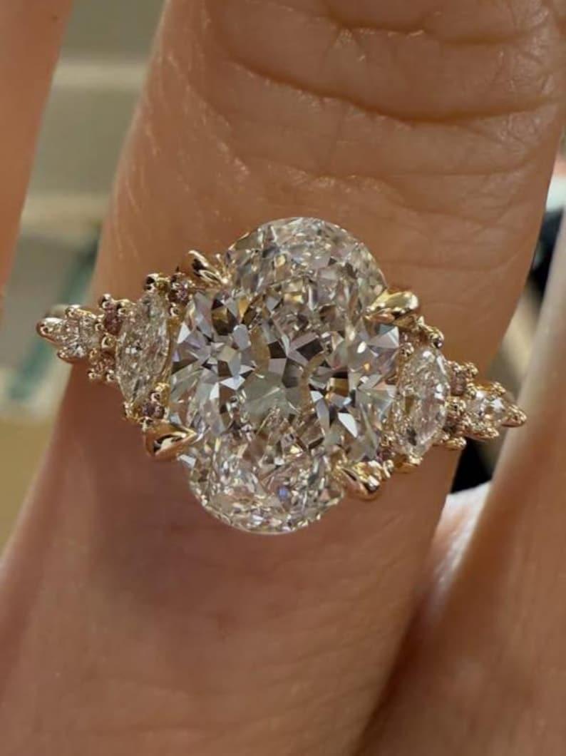Enhancing the center stone are elegant marquise-shaped side stones, which add extra sparkle and create a distinctive, eye-catching design. Their graceful shape perfectly complements the oval center stone, forming a balanced and luxurious look.
