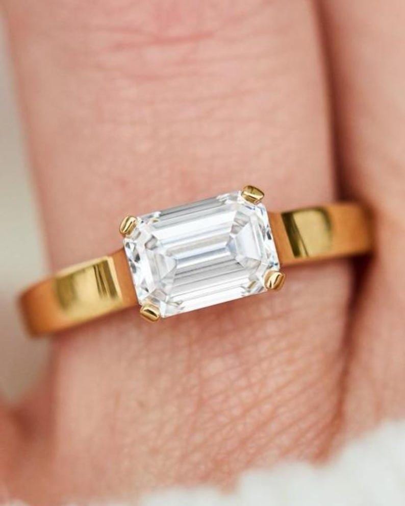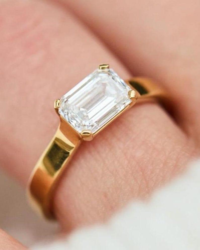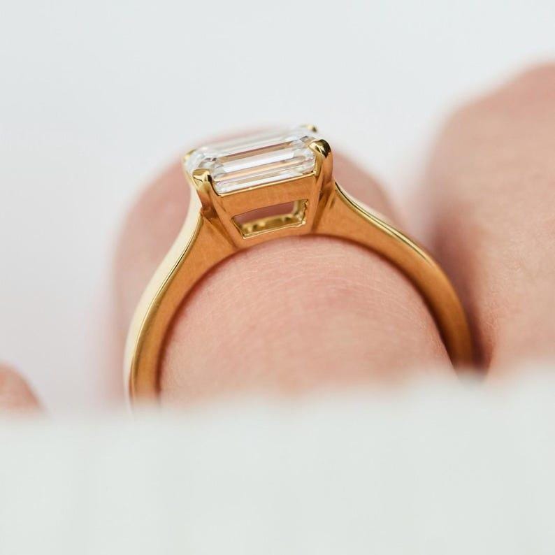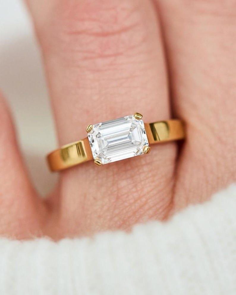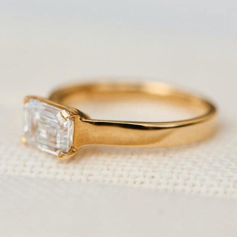 The gemstone is set in a unique east-west orientation, placing the emerald-cut stone horizontally across the band for a modern and eye-catching look. This distinctive setting gives a fresh twist to the classic solitaire design while maintaining a sleek and elegant appearance.