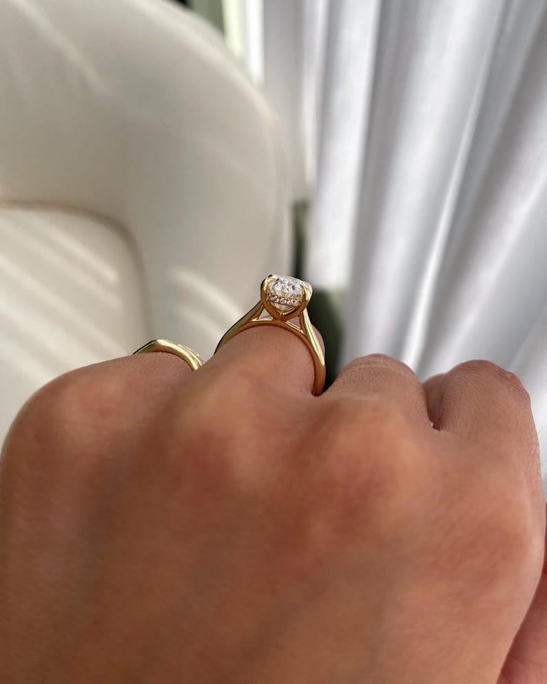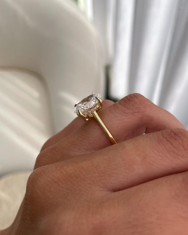 Beneath the center stone lies a delicate hidden halo, featuring small shimmering stones that add a subtle layer of brilliance. This hidden detail enhances the sparkle of the ring while maintaining a clean and elegant look from the top view.