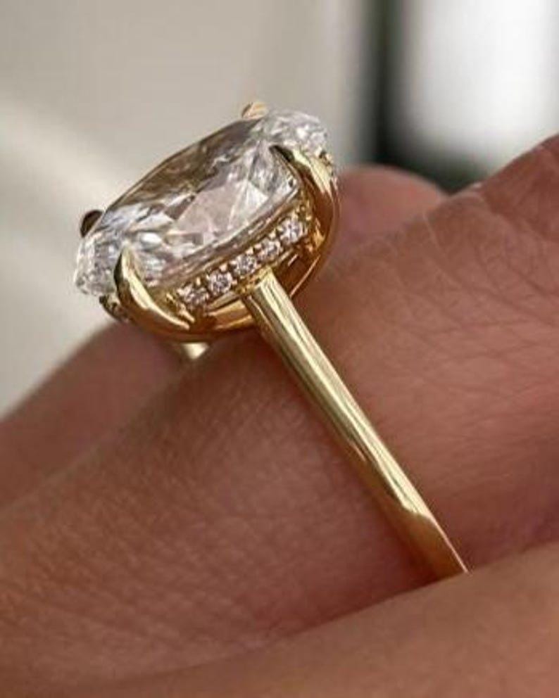 4 CT Oval Cut Moissanite Engagement Ring, Dainty Thin Yellow Gold Band, Hidden Halo Diamond Ring, Promise Ring, Anniversary Ring