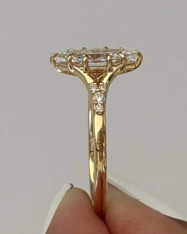 At the center of this beautiful ring is a dazzling 2 carat marquise-cut moissanite, admired for its distinctive elongated shape and exceptional sparkle. The marquise cut reflects light beautifully, creating remarkable fire while its pointed ends give the finger a longer and more graceful appearance.