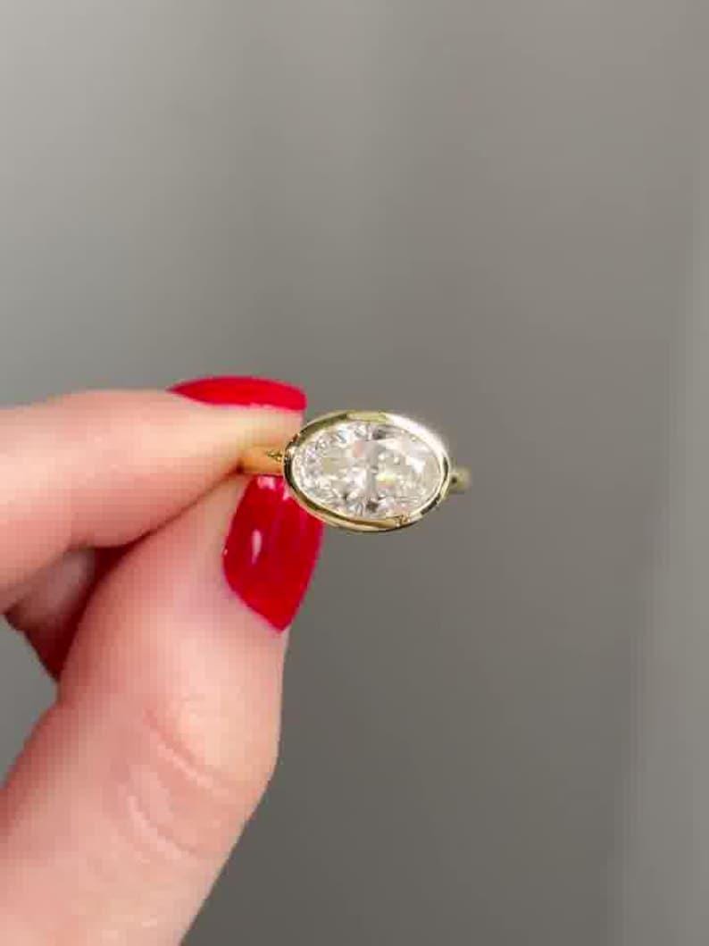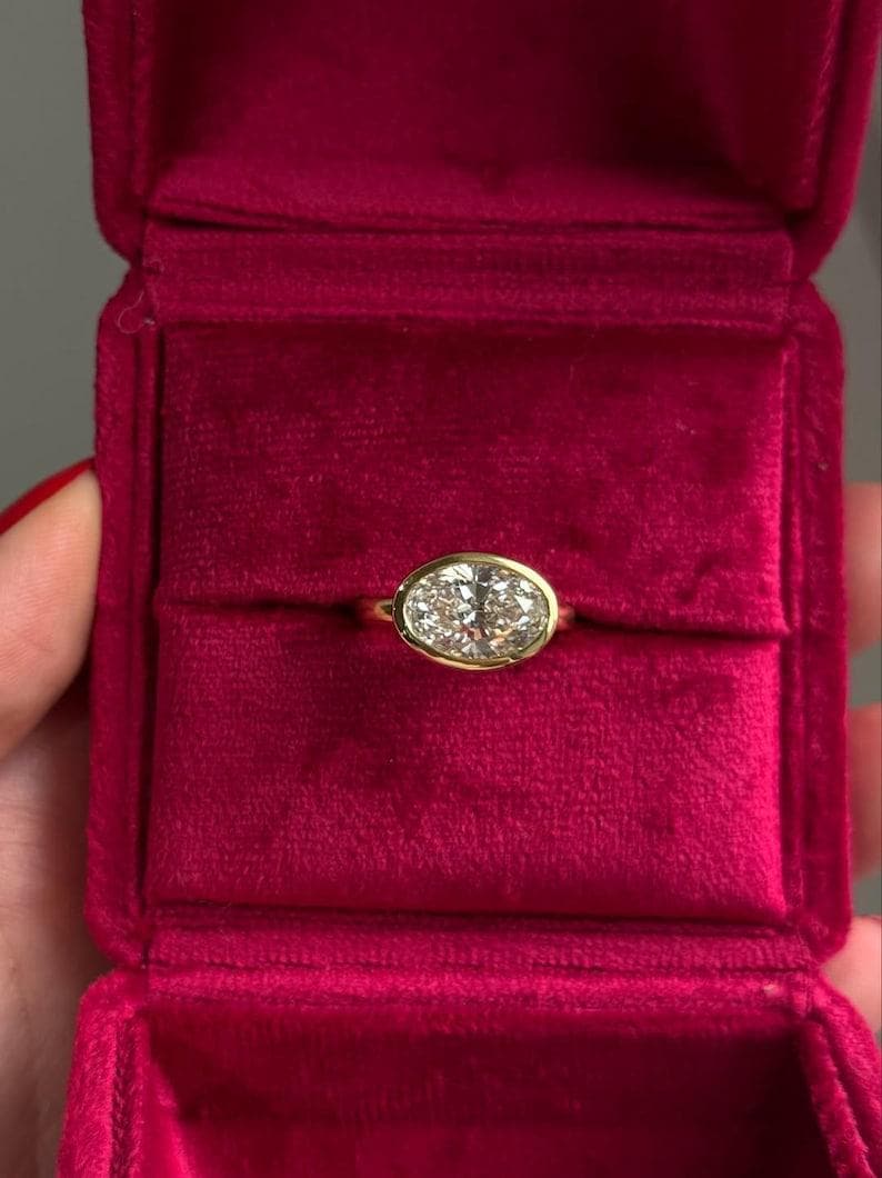 What makes this ring truly unique is the East-to-West setting, where the oval stone is placed horizontally across the band instead of the traditional vertical position. This distinctive design gives the ring a modern, stylish twist while maintaining its timeless appeal.