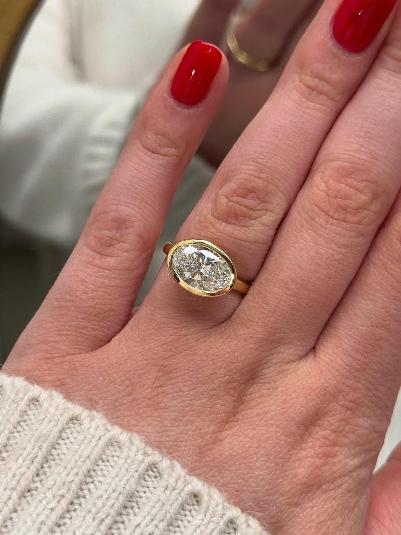 Bezel Set 3 CT Oval Cut Moissanite Diamond Ring East To West Set Solitaire Ring 14k Solid Gold Wedding Ring Anniversary Ring Thank You Gift