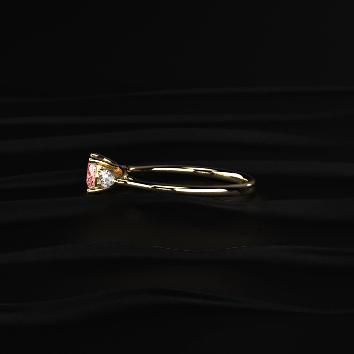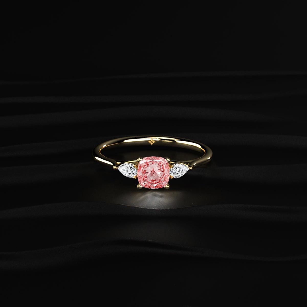 pink diamond engagement ring, cushion cut pink ring, three stone engagement ring, Pear side stone ring, lab grown pink diamond, unique engagement ring, romantic proposal ring, blush diamond ring, fine jewelry engagement, luxury bridal ring, pear side stone ring, pink cushion engagement ring, blush pink diamond ring, three stone pear ring, unique pink engagement ring