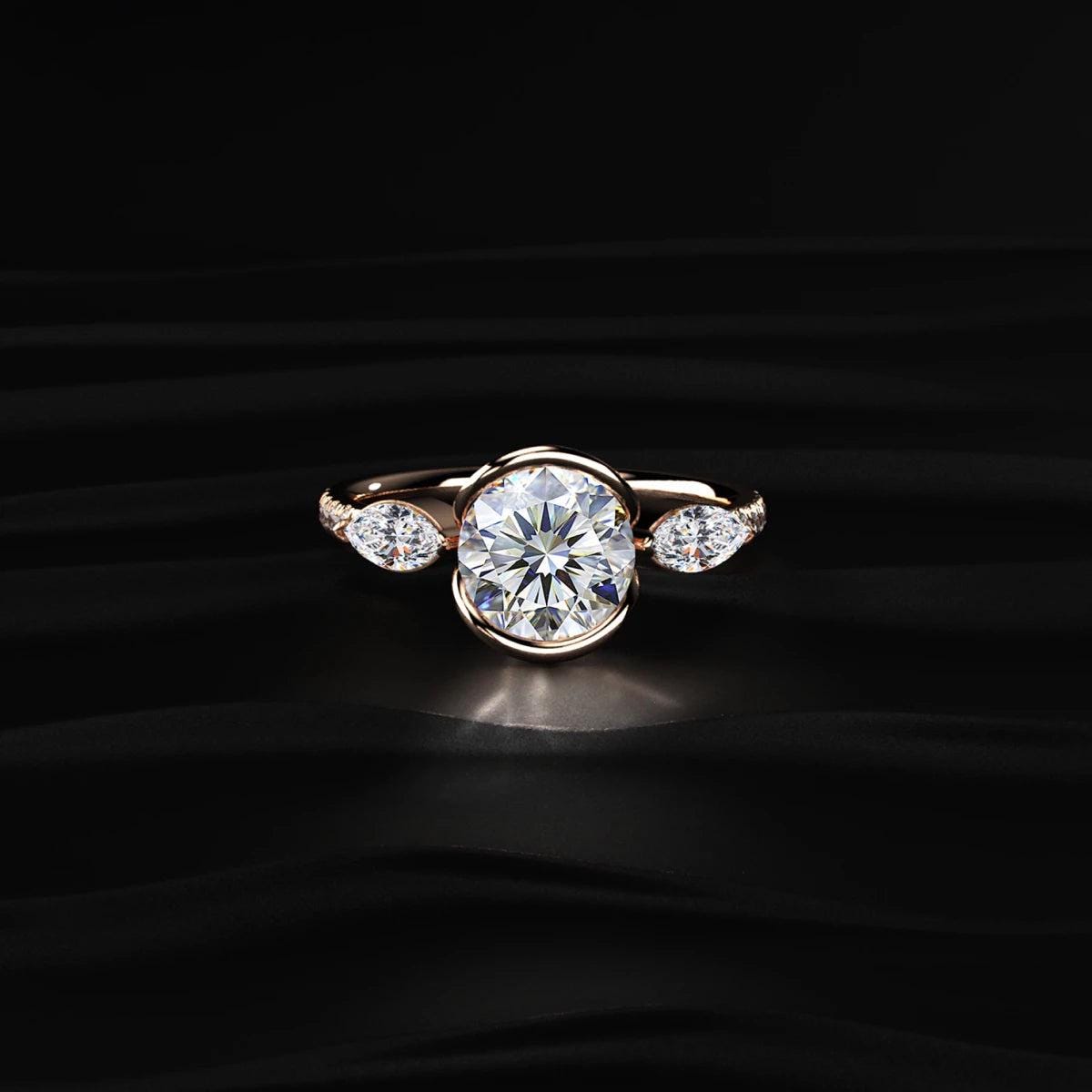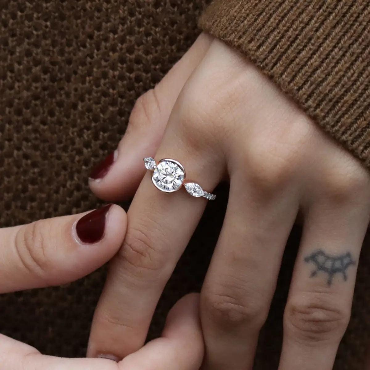 bezel set engagement ring, Marquise side stone ring, leaf diamond ring, nature inspired ring, round bezel diamond ring, unique engagement ring, lab grown diamond ring, floral engagement ring, marquise side stone ring, bezel engagement ring, leaf diamond ring, nature inspired ring, unique engagement ring, round bezel diamond ring, lab grown diamond ring, floral style ring