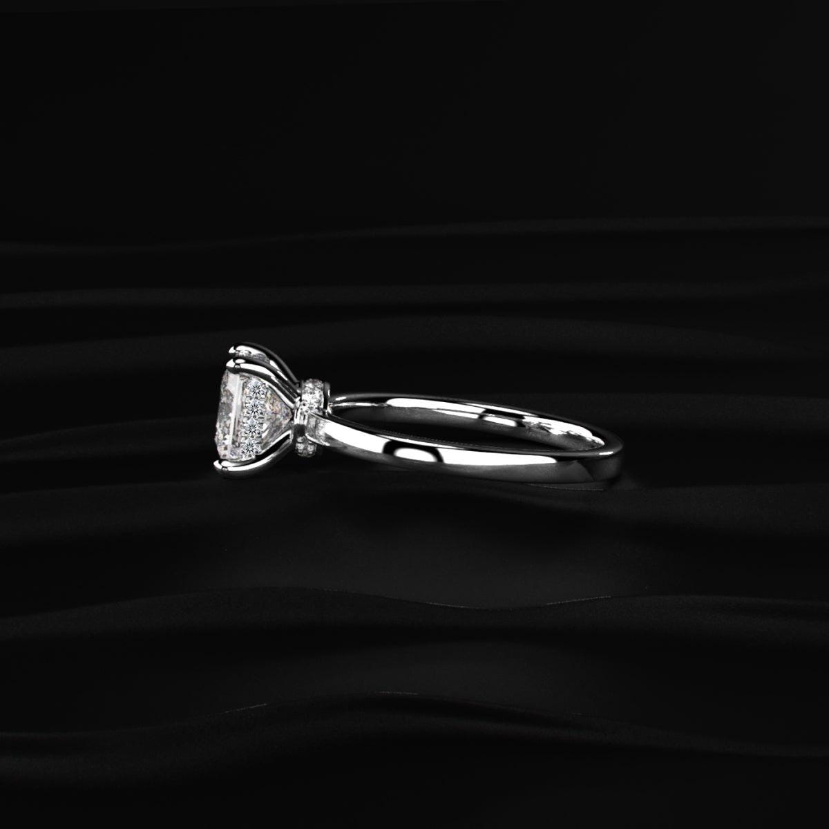 The hidden halo setting adds a subtle layer of sparkle beneath the center stone, enhancing its overall shine while maintaining a clean solitaire look.