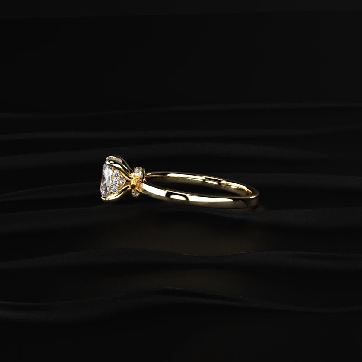 The hidden halo setting enhances the center diamond by adding extra sparkle beneath it, making the stone appear larger and more radiant.