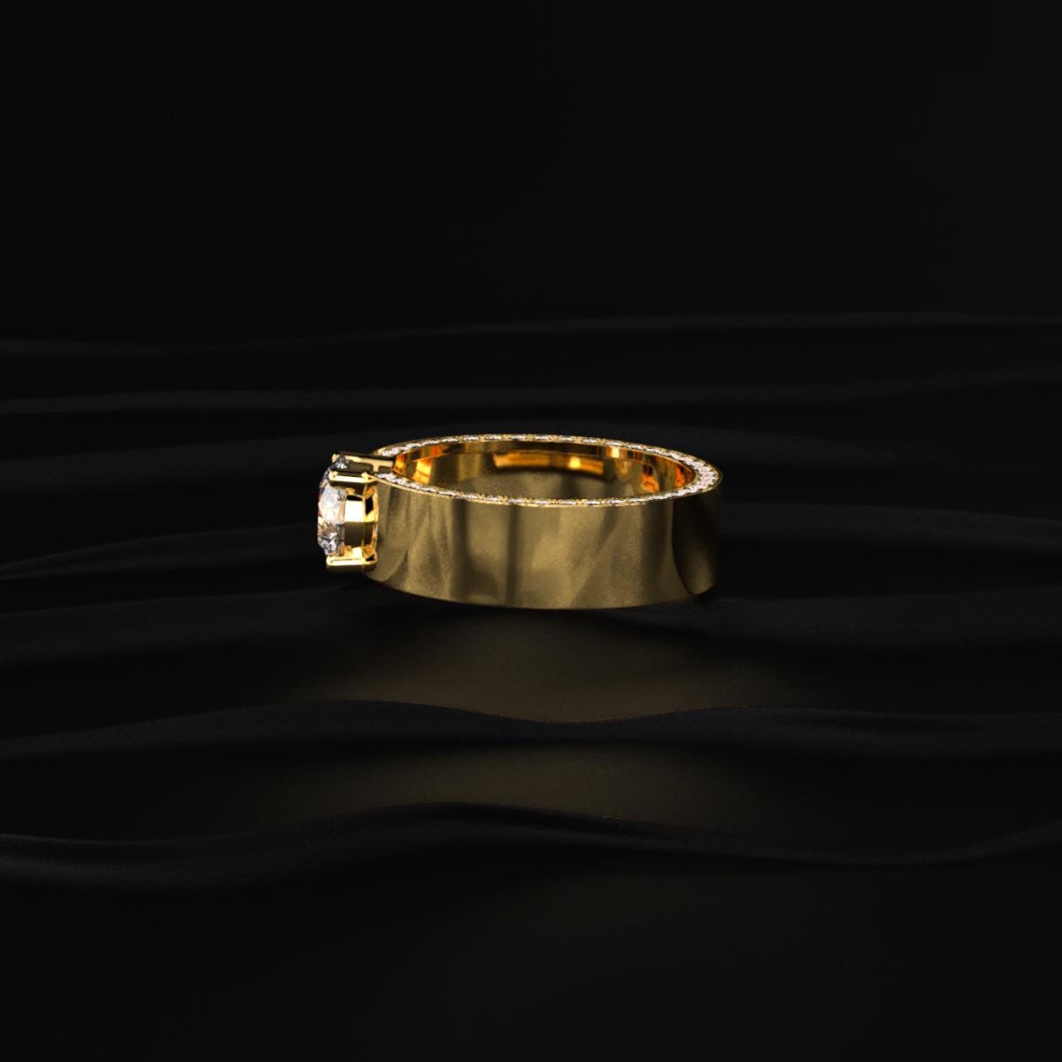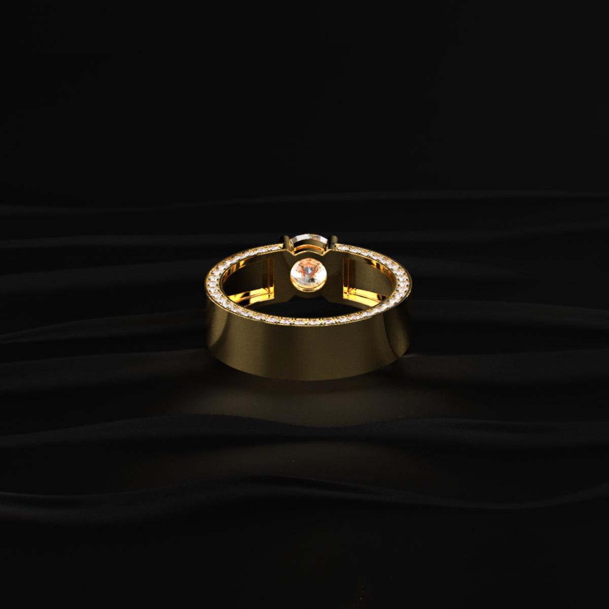 The round brilliant diamond offers maximum sparkle, while the wide gold band gives a strong and masculine presence.