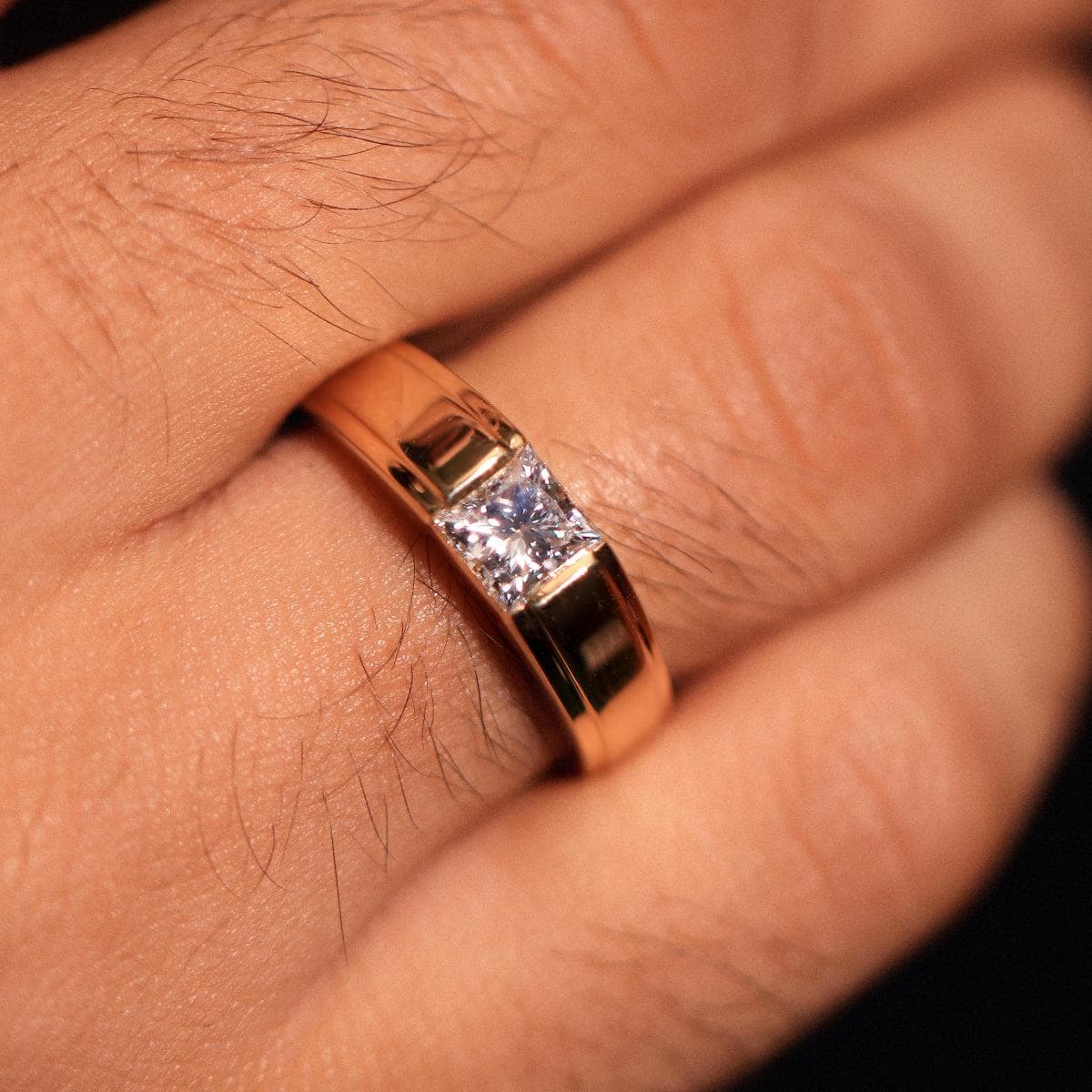 princess cut mens ring, channel set diamond ring mens, modern mens engagement ring, bold mens diamond ring, luxury gold mens ring