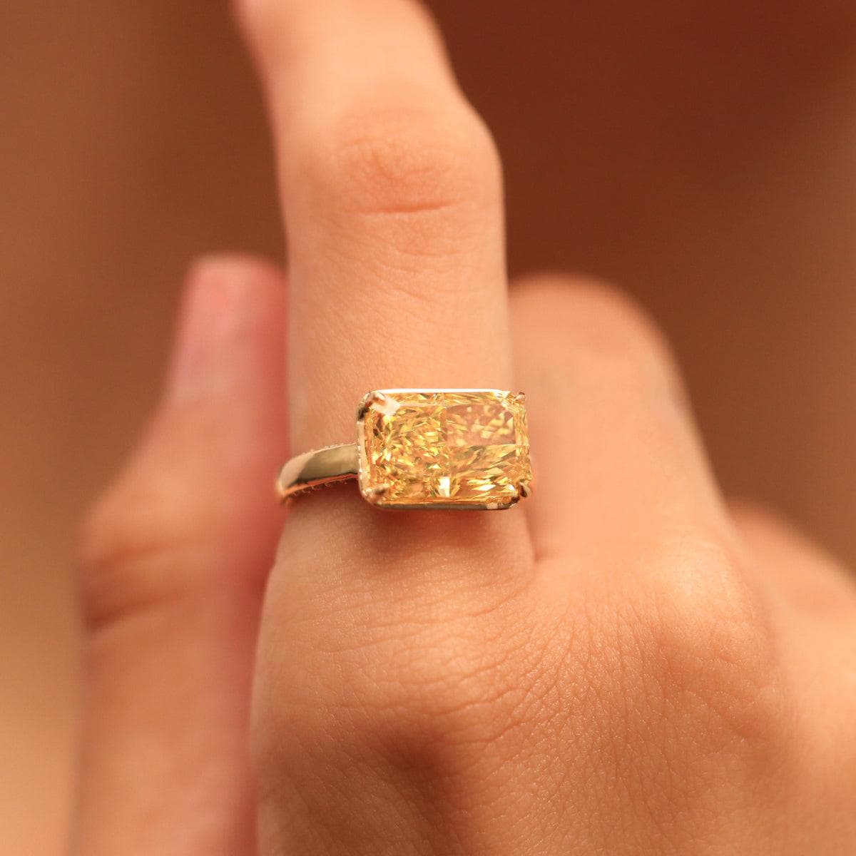 โจThis breathtaking 4.50 CT Yellow Radiant Cut Diamond Ring features a classic prong setting that allows maximum light to pass through the stone, enhancing its brilliance and fire.