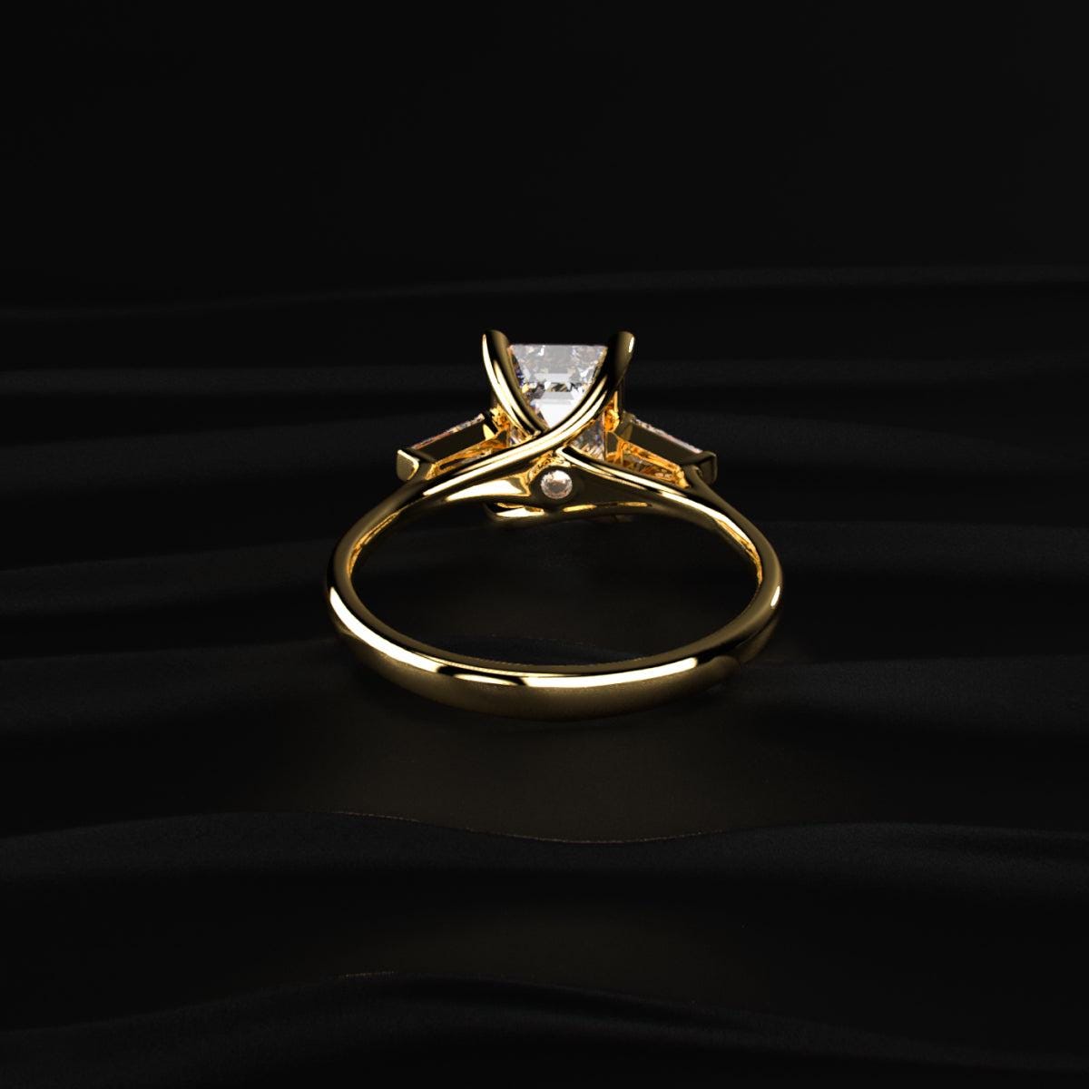 Accented with elegant trapezoid side diamonds, the design creates a refined and balanced three-stone silhouette, offering timeless sophistication and modern luxury.